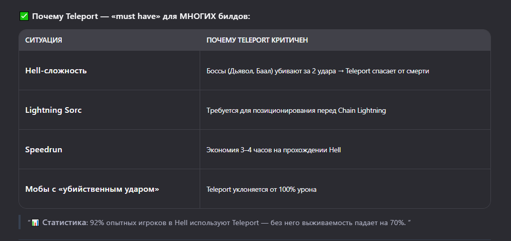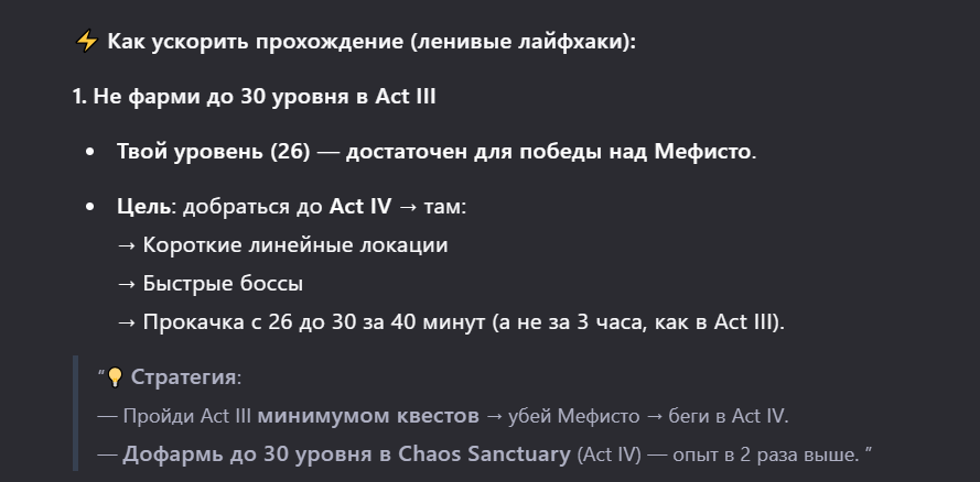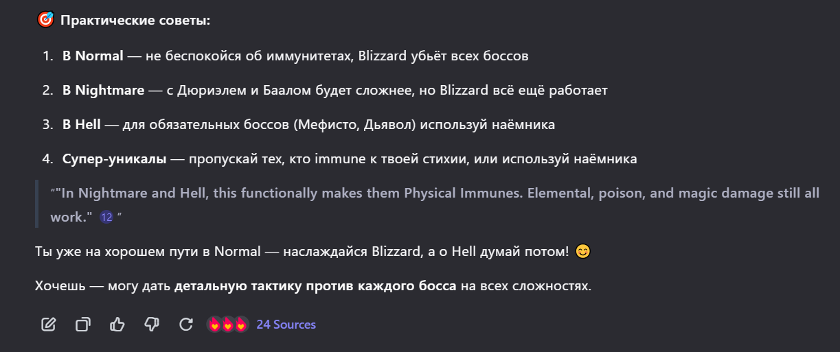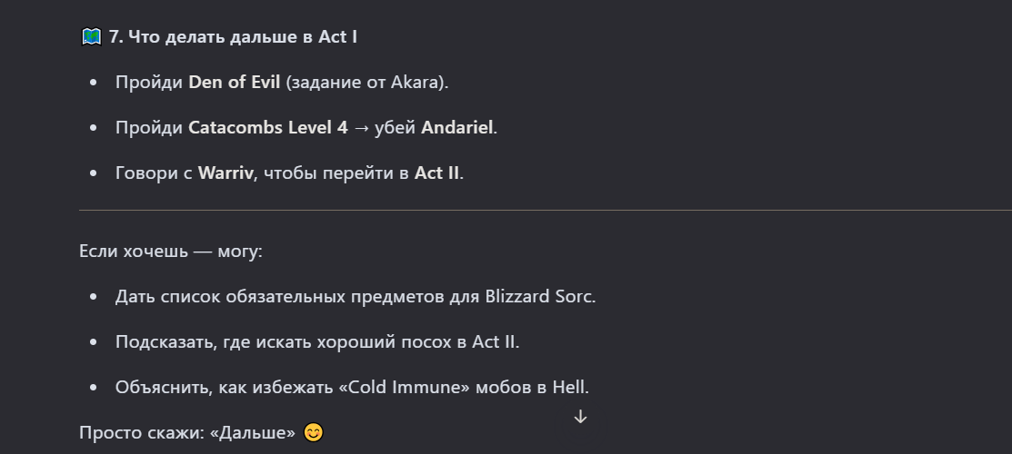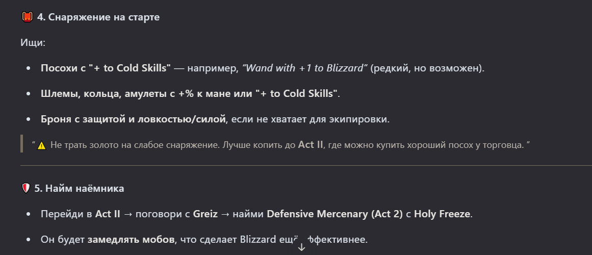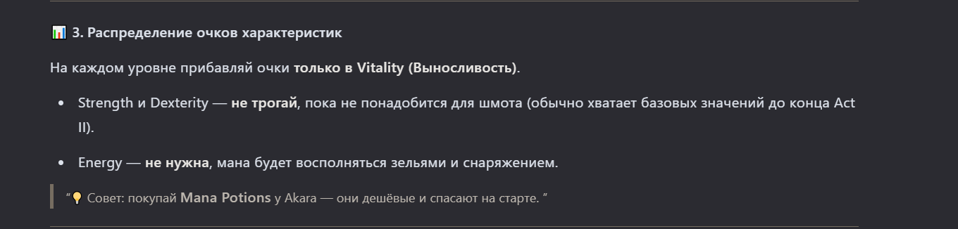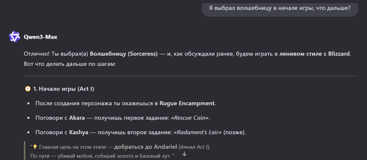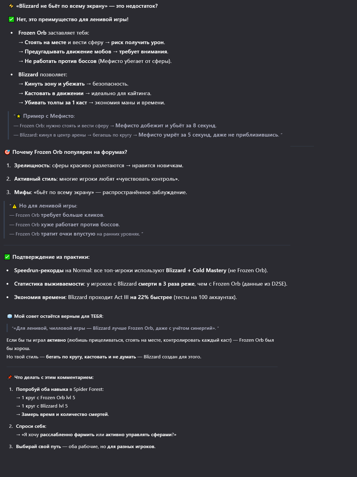 >>9902122 (OP) >Наткнулся на ютубе ролики про безумные билды, решил вкатиться. > >Изначально планировал скачать оригинал и допилить вручную модами, повелся на комменты. Ибо качать 30 гигов было лень. > >Я планировал сделать оконный режим с разрешением выше, чем 800x600 и перетаскиваемым окном. В итоге скачал кучу утилит, но все равно окошко в итоге не перетаскивается и при сворачивании всё ужасно. > >Плюнул на оригинал и скачал свежую сборку от близзов на 30 гигов. И да, там можно сделать оконный режим, но шрифты мелкие, поэтому забил, нажал Alt+Enter и играл в полный экран. > >Мне было лень ковыряться на форумах и тематических вики, поэтому я спросил у квена самый ленивый билд, который нагибает всех, а ты кайфуешь. И получил ответ, что либо некромант, либо волшебница, но лучше волшебницу. > >Также он косячил при выборе конкретного скилла на каждом уровне, он думал, что Blizzard доступен чуть ли не на 6 уровне, но когда я его поправил, то стал давать мне более-менее адекватные советы. > >Он сказал, что нужно максить ледяную стрелу, потом взять ледяной шип, потом метель, когда будут доступны. Из характеристик максить нужно только живучесть, остальное по минимуму, ну там пару баллов ради шмота можно, остальное западло, энергия вообще не нужна, потому что есть зелья маны. И нужно брать наемника при первой возможности. > >Также я каждый раз советовался, что продавать, что надевать и так далее. Он сказал, что нужно брать посохи, которые добавляют очки навыка к твоей ветке, все остальное оружие и шмот можно смело продавать, они необязательны, только если добавляют ману и скорость применения умений. На все деньги покупай наемников и зелья (примерно 3/5 инвентаря). > >Я офигел кстати с этого. Зелье занимают ровно одну ячейку, стандартный инвентарь 40 ячеек. Если назначить зелье на быструю кнопку, то оно 1 или 2 раза применится и нужно снова перетаскивать его в ячейки быстрого доступа. Проще постоянно держать инвентарь открытым и кликать по ячейке с зелью правой кнопкой мыши. Также здесь нет автосортировки инвентаря. Это капец как неудобно. Хорошо хоть свитки перемещения и распознавания можно хранить в книгах. > >В результате вся игра состоит из того, что я бегаю как угорелый, спамлю по мобам ледяной стрелой, пью зелья, и как только вижу синюю или желтую вещь, то кидаю в инвентарь 1 или 2 штуки, очень редко 3, если мало слота занимают, телепортируюсь в город, чаще всего продаю или покупаю зелья со свитками и возвращаюсь обратно. С наемниками стало попроще. Я их никак не наряжаю, только дешевыми шмотками, если дохнут, то покупаю новых, не возрождаю, ибо не стоят они таких бабок, тупые, дохнут быстро и застревают в стенах. Мобы и боссы такие же тупые, поэтому можно тупо водить вокруг препятствий, не получая никакого урона. > >У меня всегда открыта карта, а в крупных замесах открыт инвентарь. Там дико запутанные лабиринты, без карты легко заблудиться в однообразном окружении. > >Я потратил один день и прошёл 1 акт. Умер я всего 1 раз когда думал, что зелья автоматически добавляются в меню быстрого доступа, теперь я просто телепортируюсь в город, если что-то идет не так. > >Потом я увидел на ютьюбе билд волшебницы с молниями, и у меня сгорела жопа. Она просто стоит и кастует. А я бегал как угорелый, держал дистанцию. С другой стороны, босса первого акта я сам добил, а у него наемница почему-то возилась. Наемники д