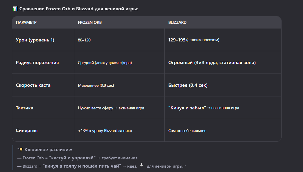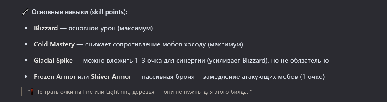 Все с точностью наоборот за сорку в зависимости от стихии ты терпишь до 12/18 уровня и макситься в первую очередь основные навыки а не синерджи к ним, потому что близзард + 20 и болт + 1 > чем болт + 20 и близзард + 1 т.к в первом случае он мощнее раз 6 если не больше