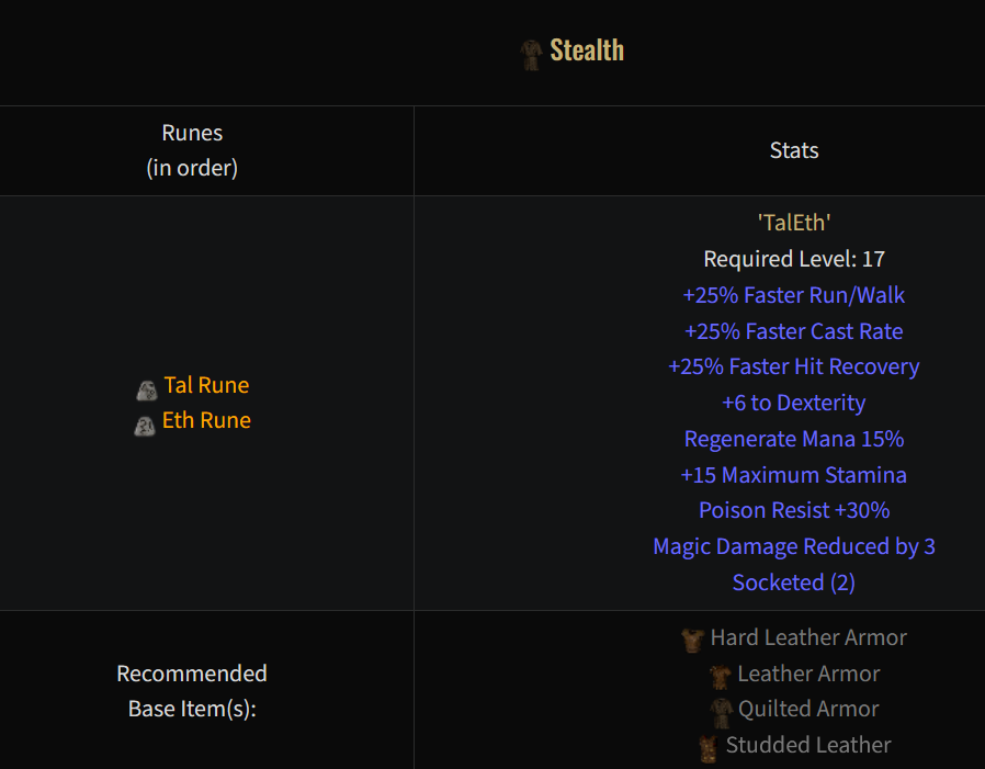 Тебе ничего не мешает собрать рунные слова Stealth (у тебя руны в сундуке лежат лол) и Leaf (руна Tir у тебя в сундуке, Ral нафармишь у Графини в первом акте или соберешь 3 руны Tal и в кубе скрафтишь 1 Ral).