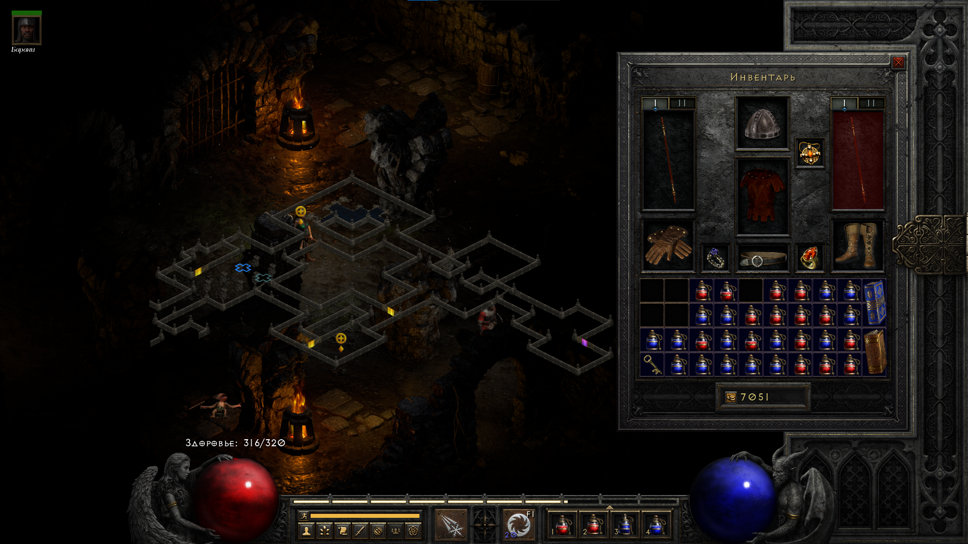 Потом я увидел на ютьюбе билд волшебницы с молниями, и у меня сгорела жопа. Она просто стоит и кастует. А я бегал как угорелый, держал дистанцию. С другой стороны, босса первого акта я сам добил, а у него наемница почему-то возилась. Наемники дохнут как мухи, если ТП-шнуться и вернуться, то у босса снова полное здоровье, но всяко лучше, чем начинать с нуля.