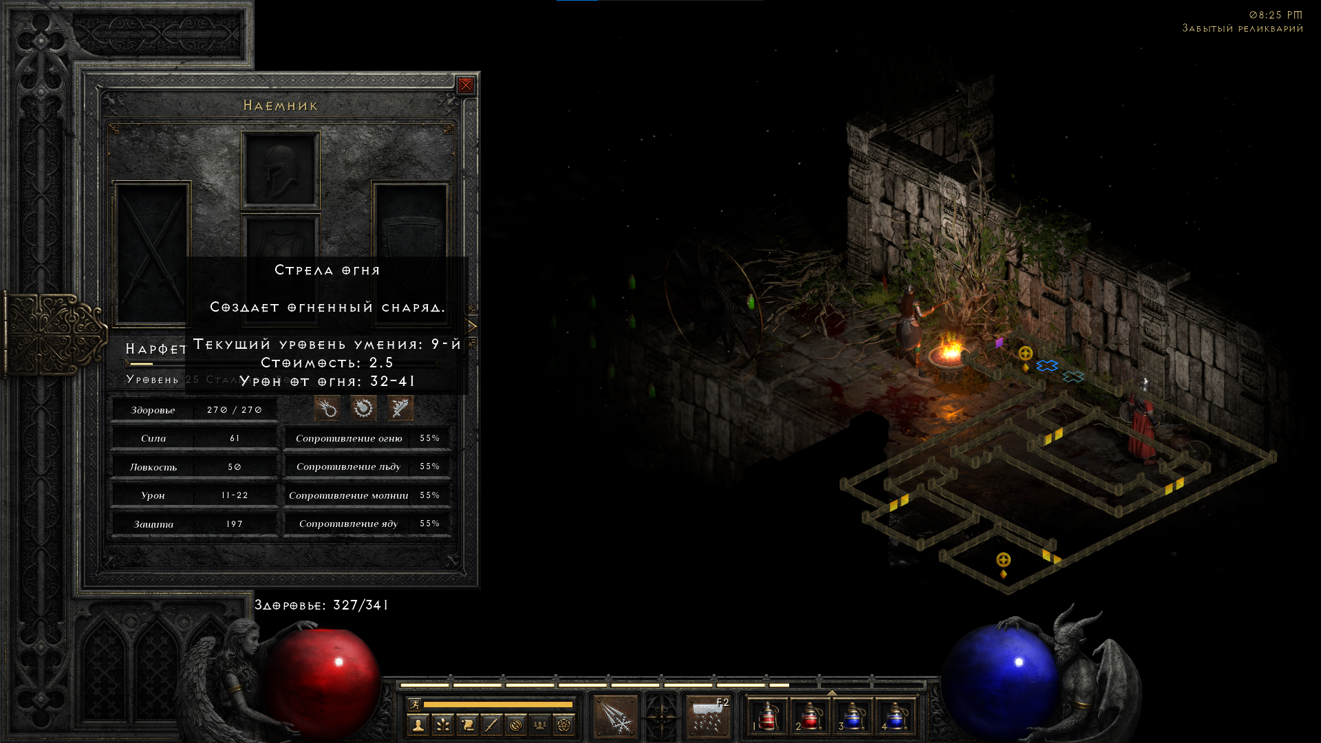 В результате вся игра состоит из того, что я бегаю как угорелый, спамлю по мобам ледяной стрелой, пью зелья, и как только вижу синюю или желтую вещь, то кидаю в инвентарь 1 или 2 штуки, очень редко 3, если мало слота занимают, телепортируюсь в город, чаще всего продаю или покупаю зелья со свитками и возвращаюсь обратно. С наемниками стало попроще. Я их никак не наряжаю, только дешевыми шмотками, если дохнут, то покупаю новых, не возрождаю, ибо не стоят они таких бабок, тупые, дохнут быстро и застревают в стенах. Мобы и боссы такие же тупые, поэтому можно тупо водить вокруг препятствий, не получая никакого урона.