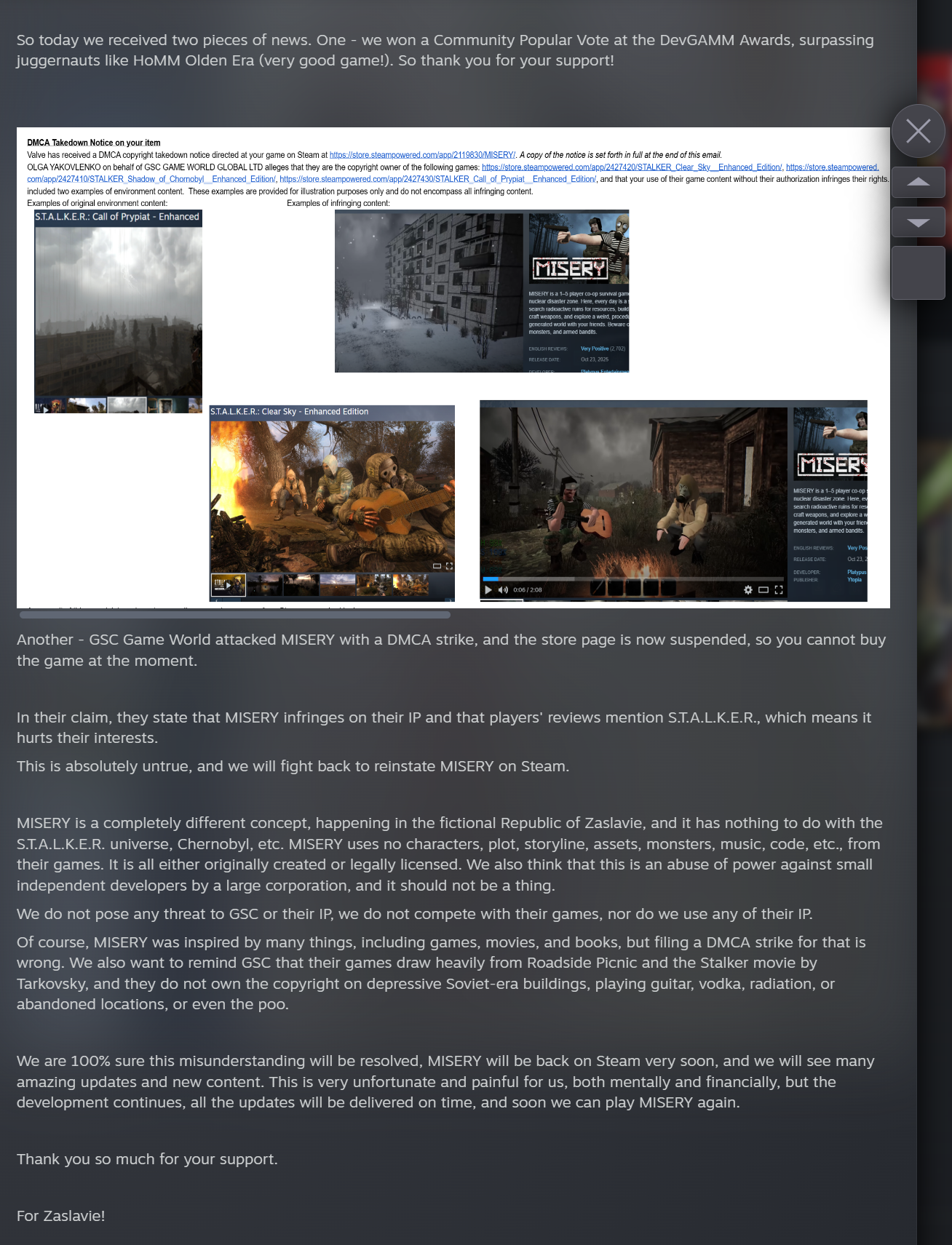GSC добились удаления из Steam мемной Misery от белорусских разрабов