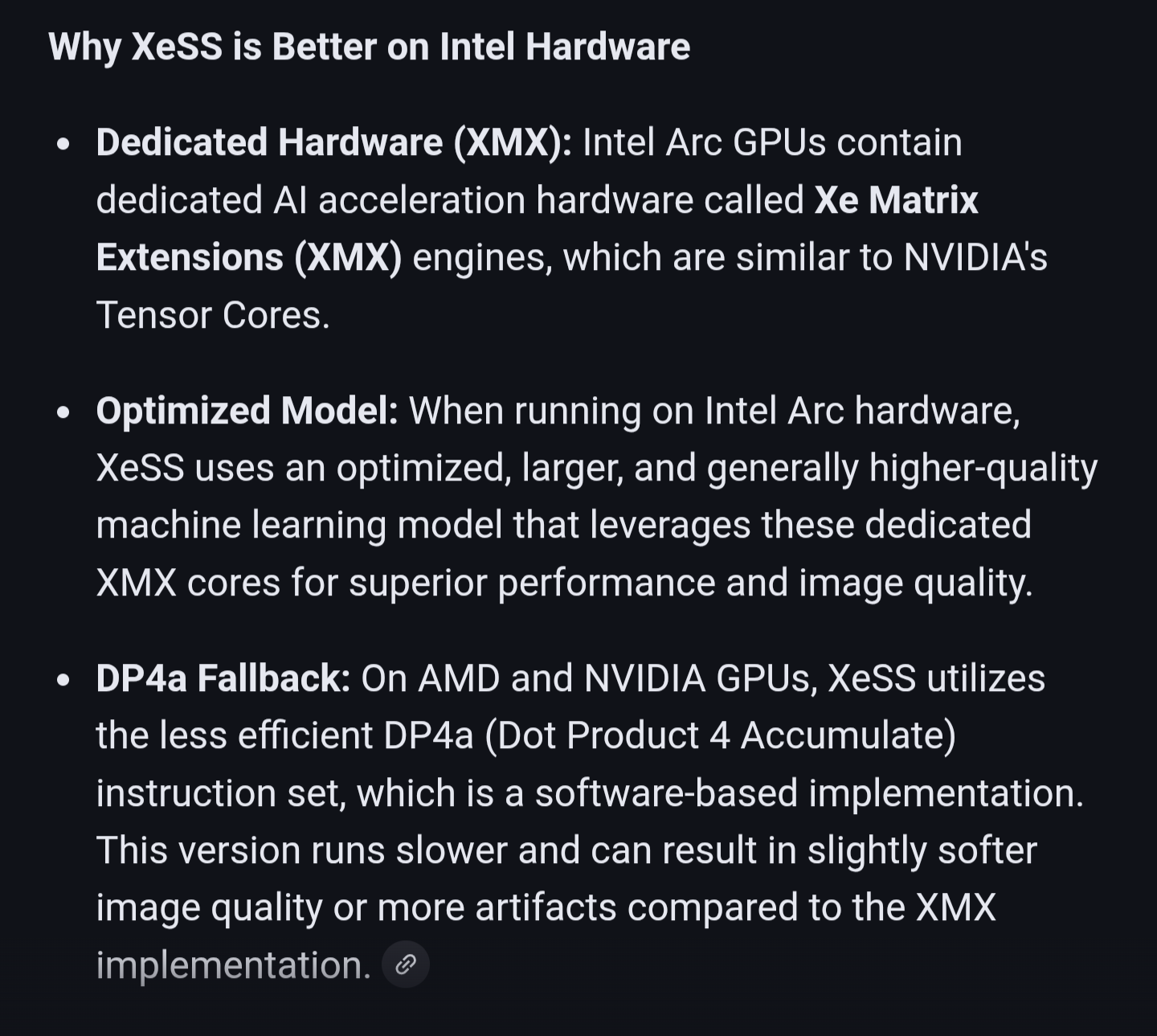 DLSS 4 >>> DLSS 3 = TSR > FSR 4 > старый XeSS > TAAU > TAA > говно > моча > малафья > FSR 2/3 > FSR 1 Успел попользоваться всем этим, вот мой опыт: - DLSS 4 годнота и лютый ахуй, не мылит на качестве даже в 1080п, в 4к можно спокойно ставить баланс или перф, DLAA теперь оверкилл и ничем не отличается от квалити, через драйвер заменяется в любой игре с длсс 2+ - TSR годнота в УЕ5 играх, картинка на уровне длсс 3, бывает даже постабильнее за счет плотной интеграции в ypинoдвижок - FSR 4 наконец-то приблизился к длсс 3, в 1440п и 4к норм, в 1080п мыло, в играх на ypине даже на рх90XX лучше использовать TSR - старый XeSS на уровне длсс 2, по крайней мере у меня так было, когда я его тестил, за неимением аналогов жить можно, новый 2.0 не тестил. А еще он может дать итоговый фпс меньше, чем без него, лел - TAAU ну тут понятно, встроенные в игры темпоральные апскейлеры, в старых играх обычно кроме него (в виде полоски разрешения рендера) больше ничего нет - TAA срань, уебище, недоносок-качествоед, мыльное убожество, нормальных реализаций по пальцам сосчитать, испортил графику целого поколения игр - FSR 2/3 в 99% игр просто сблёв, создает эффект зернистости, добавляет еще больше лесенок, при этом мылит как сука, нормальную реализацию видел только в некст-ген ведьмаке 3 - FSR 1 это просто понижение разрешения, это не темпоральный апскейл, а буквально растягивание картинки как пеинте, но с чуть лучшими алгоритмами, качество получается соответствующее