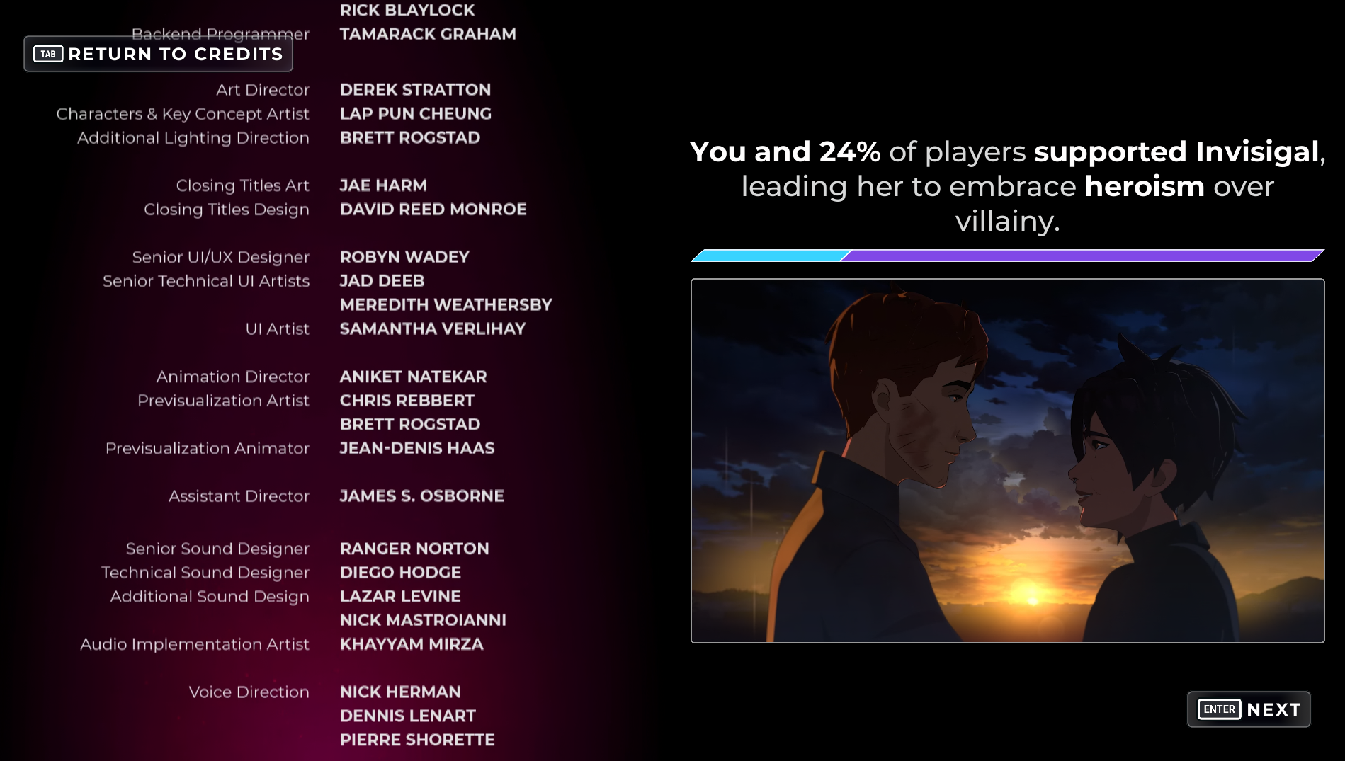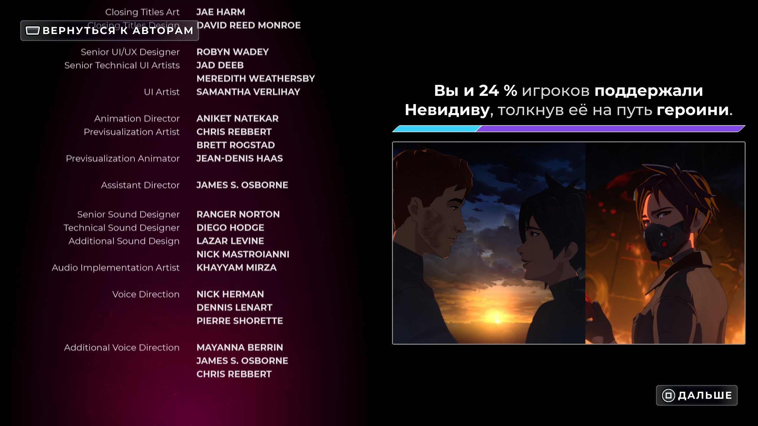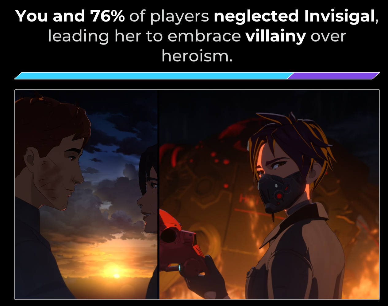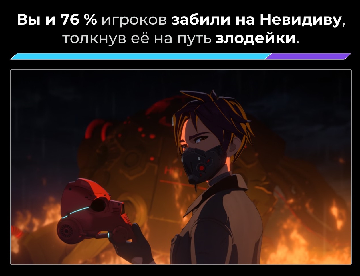 Когда второй сезон выйдет я уверен он не будет учитывать выборы первого иначе там вообще пиздец будет У кого то Невидимка злодейка новый Шрауд, а у кого то любовь Там 2 игры разных им придется делать тогда