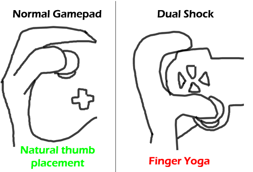 >>9921118 личный опыт не аргумент есть факт эргономики - большому пальцу комфортней сверху, ближе к другим пальцам, а не в стороне словно ты воображаемую кружку держишь 90% игр требуют жать вверх стик 90% времени, а значит палец должен быть еще выше на сонипадах палец напряжен потому что далеко от нейтральной позиции и при этом должен быть напряжен чтобы оттягивать стик, а кейс применения когда надо жать вправо вовсе требует очень сильно отставлять палец чтобы решить эту проблему стики приходится делать слишком близко к ладони иначе длины пальца не хватит нажать вправо каким нибудь детям, но для взрослых тогда стик оказывается слишком близок Факт в том что сони не меняют стики не изза эргономики, а потому что не хотят как у конкурентов и симметричные стики стали брендом, а вовсе не изза удобства их сохраняют