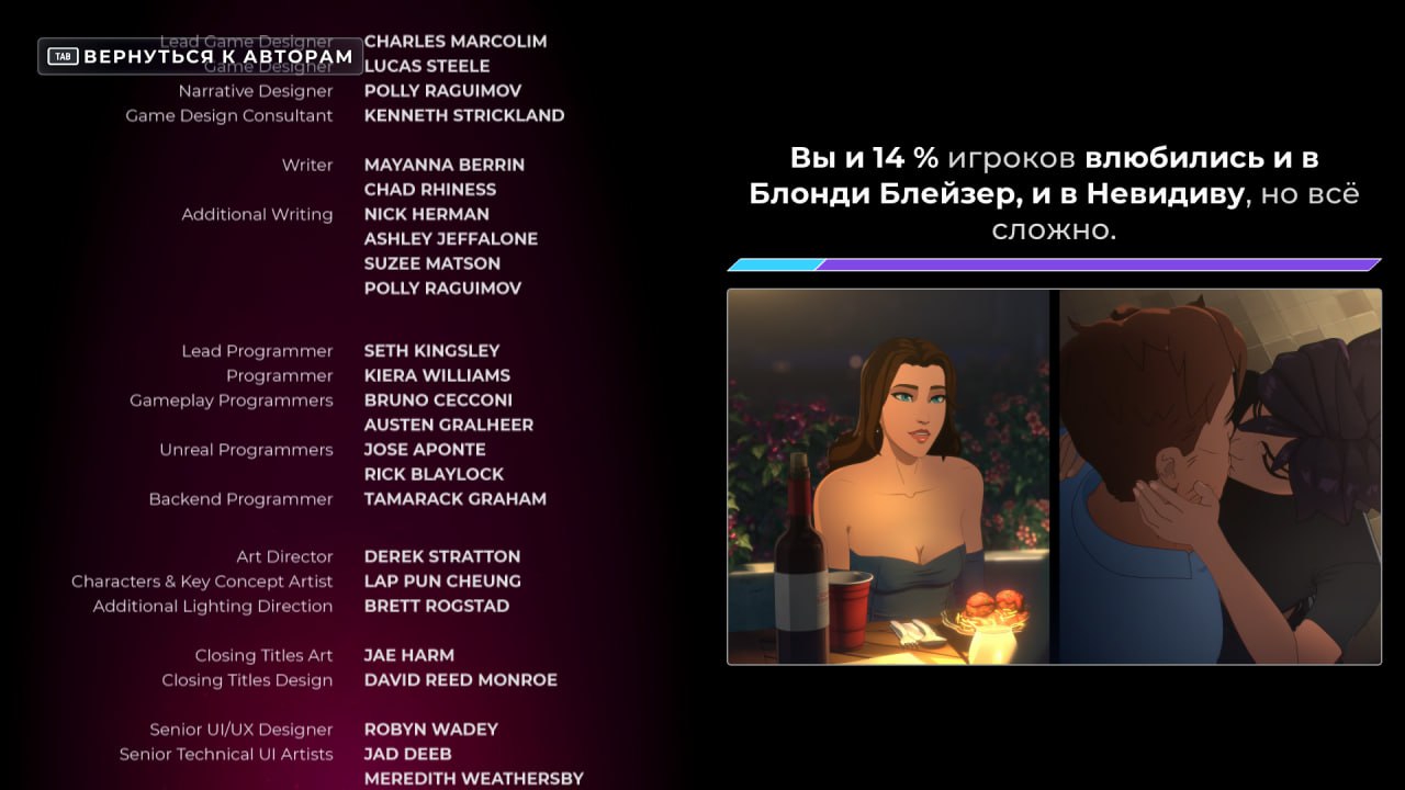 А в целом по всей игре, исключая 7-8 эпизоды, есть претензия только к романам. Все остальное понравилось, даже диспетчер дрочь. Ее стоит играть ради того чтобы голем подружился с диким котом, фламбе приготовил бананы и флирта сонара с малеволой: С - Ради тебя я готов умереть. М - Я умру первой. Невистерву эту прям силой пихают в постель прям как в меме про намеки из грифинов. В сортире преследует "мне приснилось что мы потрахались", даже платье блонди застегивали под ее присмотром. Она умудряется приревновать даже к малеволе на ее "you re cute". Выбора у тебя толком нет, выберешь блонди забивая на стерву - во время вечеринки танцуют рой и блонди, камера плывет мимо них к роберту, приближается и с противоположной стороны выпрыгивает блонди и кружит роберта в танце. А невистерву снова КОРЕЖИТ, снова ей блядь не то. Мерзкая, прям как шэдоухарт. А динамить ее не получается вплоть до сцены в раздевалке 7го эпизода. При этом если романсить невистерву то какого осуждения или негатива со стороны блонди нет, кроме одной непонятной сцены выяснения какие должны быть отноления в рабочие часы. В то время как невистерву корежит постоянно и в каждой главе.