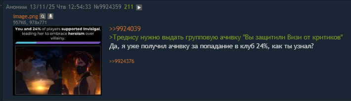 >>9923426 Ага, как и думал. Хм, я злодея деду пообещал пришить самолично, но Невидива меня обогнала. И в итоге остался середнячком. А полудин считающий что герои не убивают на такой ее мув наверное сгорел бы.