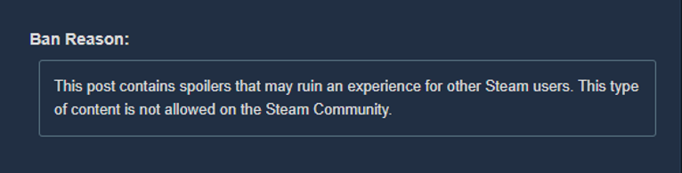 Блять, я конечно знал, что в стиме ебанутые модеры, но меня никогда ещё не банили в стиме, за обсуждению сюжета сюжетной игры, ебанутся. И это после выхода всех эпизодов, ахуеть блять соя обьебалась, по такой логике надо всех забанить, а то вдруг челик отроек, тему, а там люди сюжет обсужда.т.