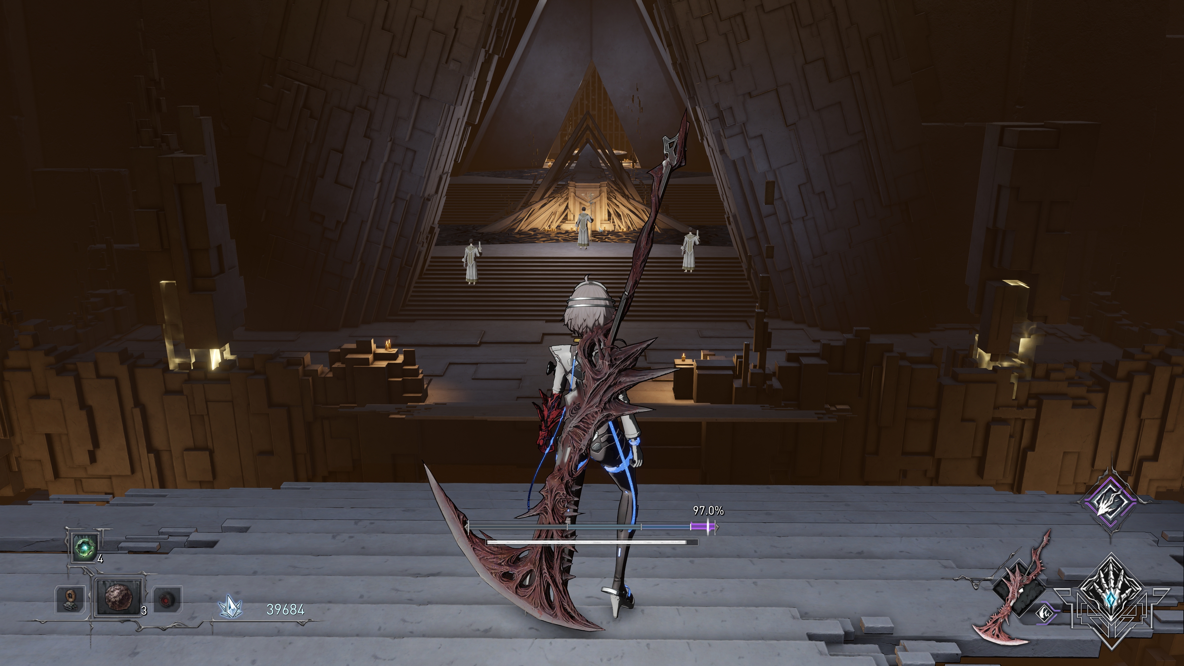 с моим билдом боссы легкие. по началу только было два тяжелых босса. а хуле: просто танчишь и бьешь в ответ - хилку получил - захилился и дальше бей. главное не получить в этот промежуток слишком много урона. но вот секретный босс по пути на тру концовку это какой-то пиздец. я сдох на нем много раз. у него есть атака при переходе на 3 фазу, которая ваншотает (как я думал) - надо уворачиваться от лучей вправо-влево, которые ну на секунду на экране появляются тяжело среагировать. и надо всю атаку задоджить, потому что одно попадание и я труп. оказалось, что когда босс взлетает и кричит, то он этой атакой сносит мне всю полоску хп, оставляя на 1 удар как раз этим самым лучом. и оказывается сука, что после крика босса и перед лучами есть окно в 1.5 секунды, когда можно захилиться и тебя не ваншотнет. более того эти лучи даже урона нормального не наносят. и я провозился дохуя времени тупо потому, что даже не мог подумать посмотреть на полоску хп в ЭТОТ ЕБАНЫЙ ПРОМЕЖУТОК потому что я был занят тем, чтобы уворачиваться от лучей блядских. по итогу босс сжалился надо мной и в одну из попыток он ни разу не использовал эту атаку. УБИЛИ ПИСТАЛЕТАМ ПРОГРАМИСТАВ ЗА ЭТУ ХУЙНЮ ЕБАНУЮ