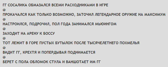 >>9924953 ПЕРЕСТРЕЛКА С БОССОМ @ ПОЧТИ КОНЧИЛИСЬ ВСЕ ПАТРОНЫ @ ВСЯ МАНА ИСТРАЧЕНА @ ХП БЛИЗКО К НУЛЮ @ БОССОВЫЕ МИНЬОНЫ БЕСКОНЕЧНО РЕСПАВНЯТСЯ @ СУКА ДА КОГДА Ж ВСЁ @ ПЕРЕЗАГРУЖАЕШЬСЯ 10-Й РАЗ ЗА МОМЕНТ ДО СМЕРТИ @ ВМЕСТО ЖОПЫ УЖЕ ЦЕЛЫЙ ПОЯС АСТЕРОИДОВ @ НЕ ВЫДЕРЖАВ, СМОТРИШЬ ПРОХОЖДЕНИЕ НА ЮТУБЕ @ ЭТО БЫЛ СКРИПТОВЫЙ БОЙ, ГДЕ ТЫ ОБЯЗАН ПРОИГРАТЬ