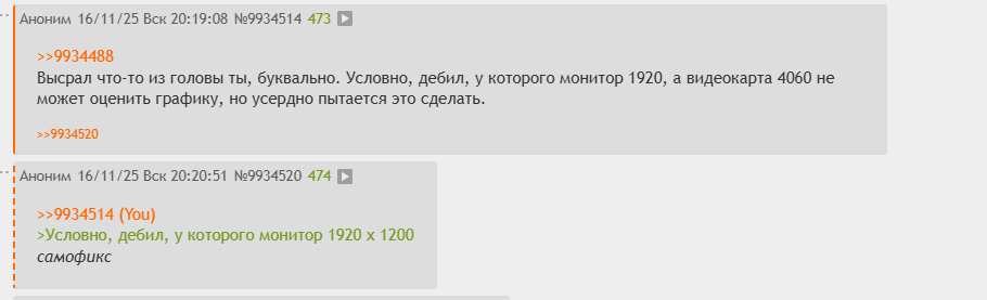 >>9934488 Высрал что-то из головы ты, буквально. Условно, дебил, у которого монитор 1920, а видеокарта 4060 не может оценить графику, но усердно пытается это сделать.