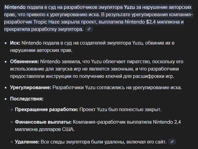 >>9913361 С эмулями свича другая история. Там тебе грозит суднбный иск, который будут специально затягивать до той поры, что ты не осилишь оплачивать услуги адвоката. Проще прогнуться.