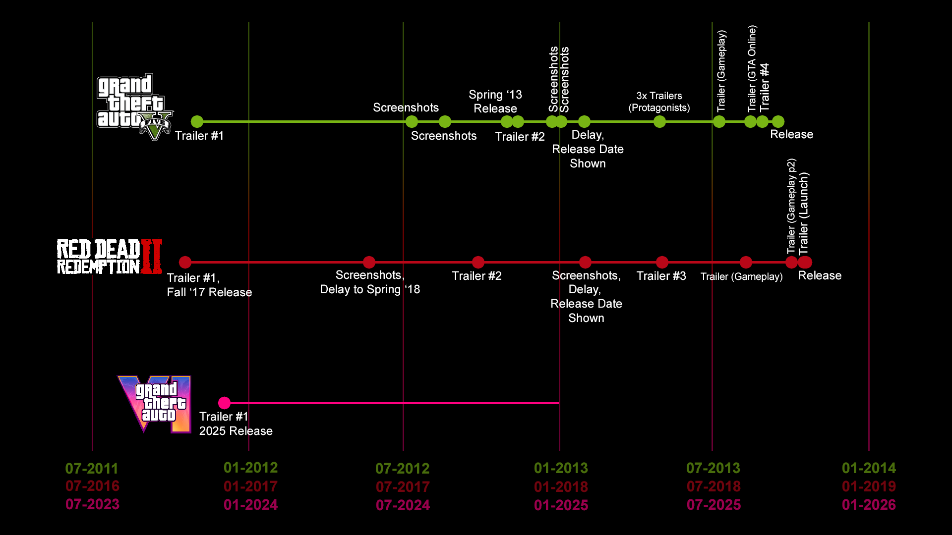 >>9911942 >>9911547 Мне ещё картинка из этого >>9911677 поста нравится, я сейчас, вооружившись интернетом, актуализировал инфу по ней до настоящего времени. Вот, наглядно видно что Рокстары вообще НИ-ХУ-Я не показали по жта6 по сути. Когда у прошлых игр уже были трейлеры, скриншоты, прочая инфа-малафья, тут же просто ТИШИНА. Так и просится вспомнить Киберсрань, где тоже нихуя не было до релиза, а то что было - только закрытые презентации где над журнашлюхами с палкой стояли чтоб они не дай Б-г ничего не записали. А тут у Кокстаров даже такого нет, лол.