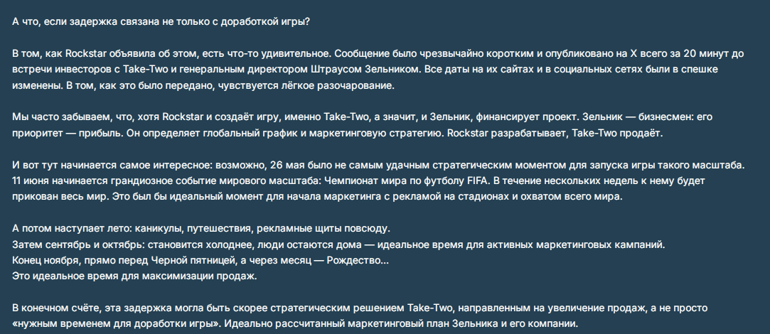 Мне вот интересно, я сам старый скуф который кайфовал с гэтэашек времен 2001-2005, четверка когда вышла произвела фурор, она и по сей день является образчиком технического совершенства и внимания к деталям. Сейчас же середина 20-х, разве зумериксы вообще шарят за эту серию? Разве для них это не старая игрушка-франшиза своих батьков, братьев итд? Типа серьезно, кокстары очень проебали момент в 12 лет, а это очень большой срок, получается некий отрыв от поколения, спору нет, хайпу зельник нагонит, нарисует еще циферки для спящих, да, игра станет поводом для обсуждения на год-два, это в лучшем случае, но станет ли она легендарной как та же вайс сити или сан андреас? сомневаюсь, щас время уже другое, опросы показывают что молодежь не хочет просиживать геморрой на часы геймплея как олды, щас все быстро движется, короче меня терзают смутные сомнения касаемо гта 6, это видать реально самая последняя часть
