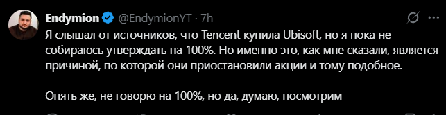 >Во внутреннем электронном письме, отправленном сотрудникам и проверенном VGC, финансовый директор Ubisoft Фредерик Дюге не дал объяснений приостановки торгов, за исключением необходимости избежать «ненужных спекуляций и волатильности рынка» во время задержки.