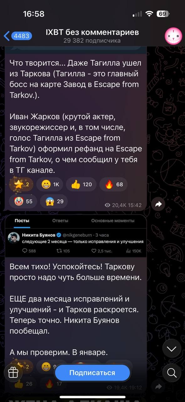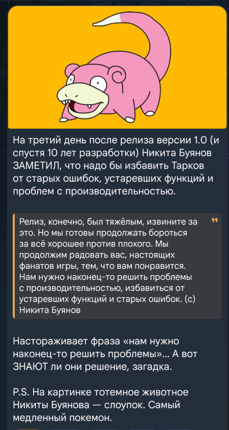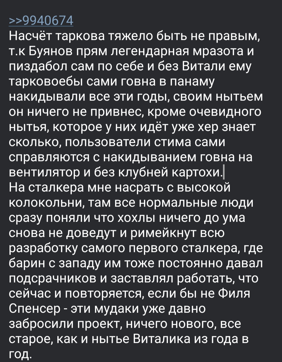 Уже четвертые сутки Виталик вместо того, чтобы накатить таблетки, накатывает пост за постом, обсуждая каждый пук в сторону таркова. И всех пытается убедить в том, что игра говно)) его тг канал превратился в клондайк высеров и эпичных цитат.