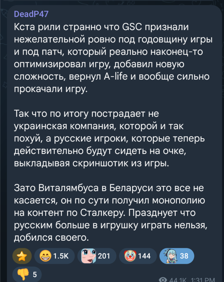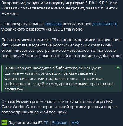>>9938709 >>9938732 Думаю, что в самое ближайшее время маркетплейсы снимут с продажи не только все видеоигры производства GSC Game World, но и любую сопутствующую атрибутику, с ней связанную. Стоит ли переживать тем, кто эту продукцию приобретал? Думаю, что во избежание возможных проблем разумным решением будет от неё избавиться.