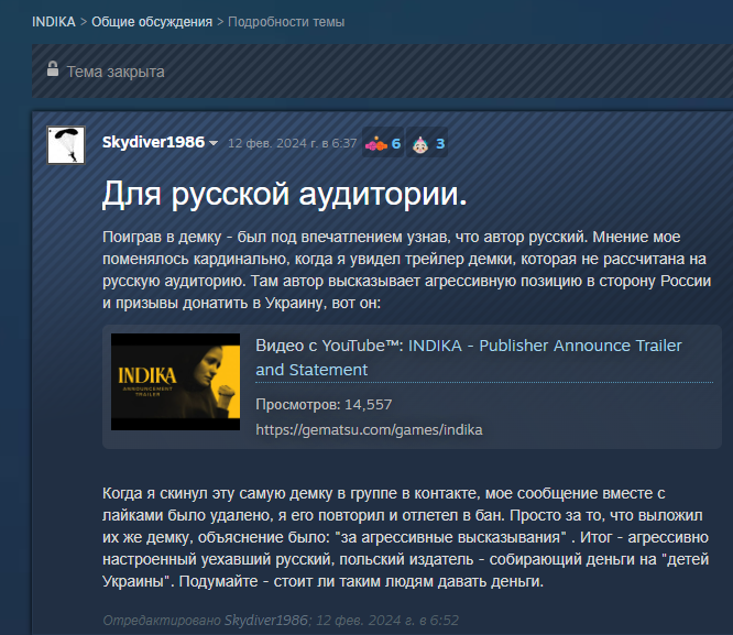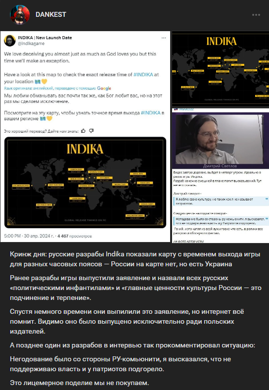 >>9947375 Нет, разрабы Индики вроде вообще за Украину, я много постов видел разных такого типа. И типа они карту мира делали где есть время Киева, но нет Москвы. А во нашел тоже на 2 скрине. Но годная игра есть годная игра. Там главный акцент на религии, а не на политике или стране. А религия у нас плюс минус одна. Сделано в Польше, кстати. Но брать не советую - лучше скачай с торрентов. Там ебаный Анриал5 с неотключаемым апскейлом как в Клеир Обскюре - придется лезть в конфиг движка в аппдате и вырубать мыло нахуй в блокноте. >>9947380 Выглядит неплохо, спасибо, попробую.