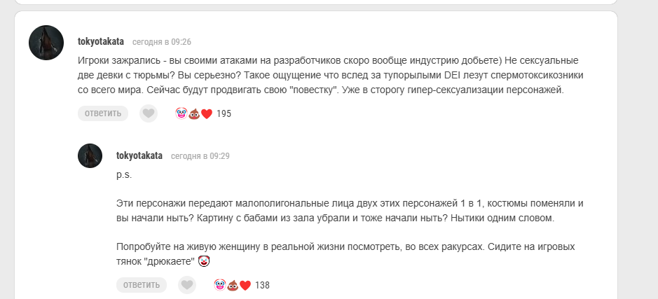 Тут прям заметно, что волну поднимают не игроки, а мимокроки, которые просто увидели привычную тему, так сказать. Потому что в этом ремейке плохо абсолютно все, показанная боевка и графика, например, просто кошмар вырвиглазный, но почему-то это не вызвало какую-то волну негодования, зато селедки Гомеза да, хотя тян НПС в игре буквально 5 штук на всю игру и это не преувеличение. То есть, на фоне всего того говна, что наворотил ремейк страшные тянки - это прям самая мизерная проблема, именно с точки зрения игрока, а не любителя срачей в интернете. И это вот печально в плане того, что всякие любители срачей примазываются к игрокам, хотя таковыми очевидно не являются, поднимают темы, которые в игре имеют наименьшее значение, а вот основные спорные моменты именно для игроков остаются без внимания.