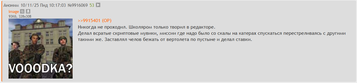 >>9916979 (OP) В офп тоже делал миссии, но в основном сидел во второй арме. Пилил там постапок сценарии ещё до хайпа DayZ, нуар (на юкозе до сих пор валяется мой сайтец с нуарными миссиями: https://blackcountry.at.ua/), ремейки миссий из первого гоуст рекона, просто что-то милитари, рофлы (вот пчел проходит мою рофл миссягу про съёб из пидapaхии: https://www.youtube.com/watch?v=gr41r3mpCsU) Знавали меня за более-менее качественный и оригинальный контент. Немного ещё попилил под трёшку, один из ремейков вертолётных миссий из ОФП там до сих пор в топе сингловых сценариев в мастерской висит (его куча ютаберов в своё время прошло, типа такого: https://www.youtube.com/watch?v=URtdoOg042E). Потом долго не было нормальной пеки под рукой, ничего на публику больше не выпускал. Пару лет назад начал в стол чисто для души всяко баловаться - пилю RPG-типа-готана на арму2 с ботами, подключёнными к ИИшке с возможностью общаться с ними текстом (в будущем мб и через микро), моддил вертолётный симулятор на двигле армы от тех же чехов (ToH) под типикал шутан с PS3, по-типу того же гост рекона, и немного даже в ОФП ремейкал прикольную старую наркоманскую кампанию про криминал УЛИЦА, почти запилил для неё лоуполи концерт Летова, лол.