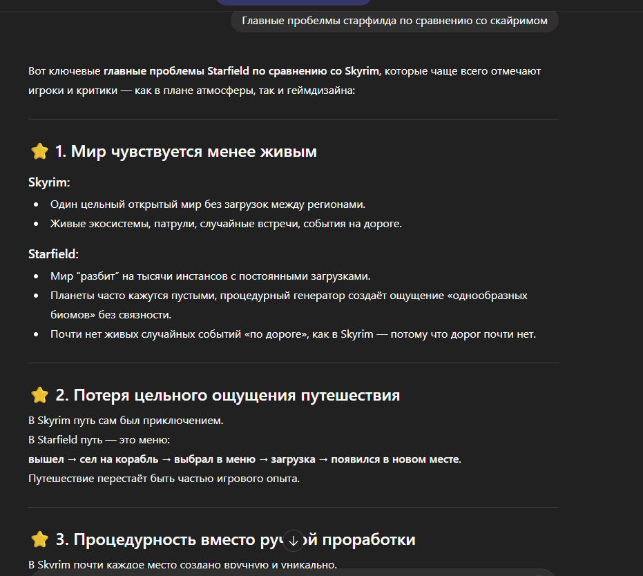 Старфилд неплохая игра, на 7 спокойно тянет, Беседка просто неудачную интерпретацию сеттинга выбрала, где всё лишь вокруг людей крутится. Сайфай начинает норм работать только с наличием разумных инопланетяшек, на манер того же Mass Effect, а у Старфилда достаточно пресный. Ну и Беседкам нужно срочно нанимать хорошего сценариста, потому что Старыилд в плане историй получился невообразимо слабым, пожалуй даже самым слабым за всю историю игр Беседок. Как проба пера нового IP сойдет, сиквел думаю будет еще очень и очень нескоро, лет через 15 где-то, учитывая что TES6 выйдет где-то в 2028, Fallout5 в 2032-33. Ну и у двощеров как всегда, игры лишь на черное и белое делится, ничего нового.