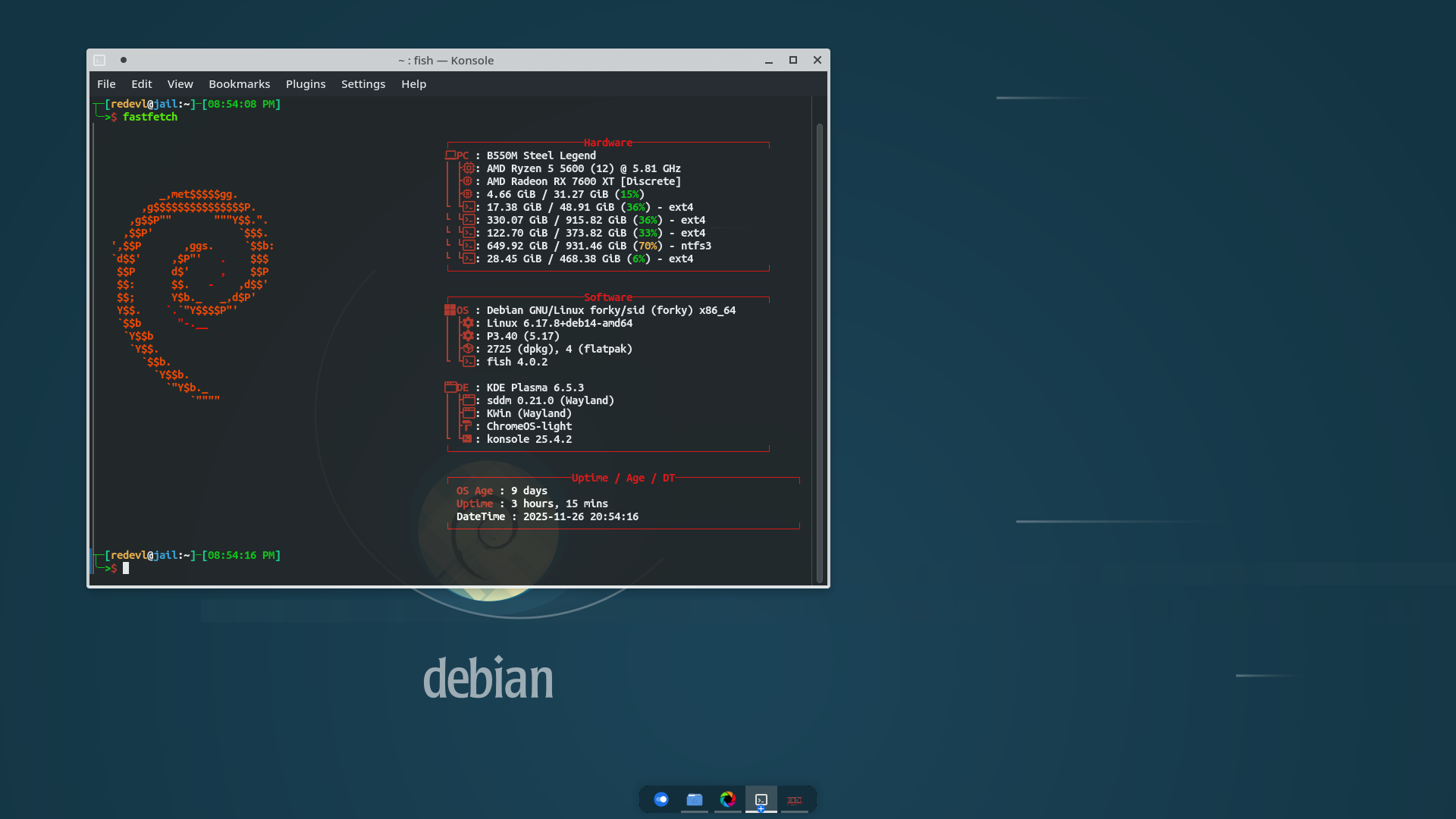 Пол года просидел на CachyOS в качестве основной системы. Созрел чтоб сделать из Debian что-то удобоваримое. Особо делать-то и не пришлось. Если в windows при переустановке системы - переустанавливаешь целиком. То тут просто заменил системный раздел на debian.