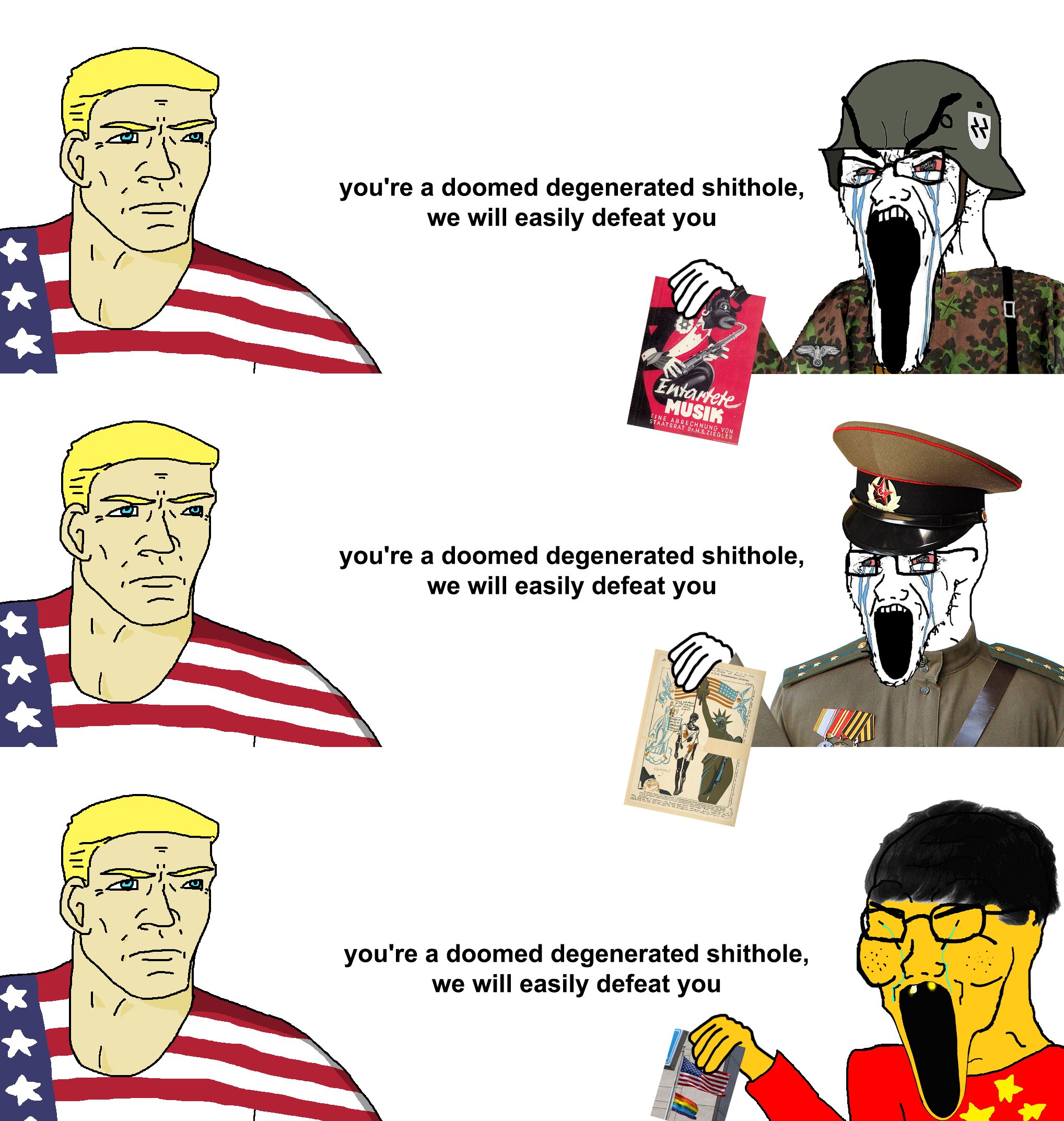 >>9945405 Вообще-то есть версия этой картинки, где наверху напротив немца белый американец, посередине напротив русского американец смуглый, а внизу напротив китайца лгбтблм+++ негр. Жаль я не сохранил ее.