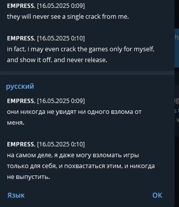 >Empress все Так к этому всё и шло, если че. Последний взлом был сделан в 2023-м, а когда его в чате спрашивали про игры он постоянно отмахивался и отвечал что-то в духе - Эта игра говно и взламывать я её не буду, да и сейчас все игры КАЛ, так что смысла их ломать нет!! А когда вышел калтомик харт, и люди ждали от эмпресс взлома, от неё вообще был смешной ответ во внутреннем чате (пикрил), а в общем чате она ответила что-то в духе: - Я не буду взламывать данную игру, потому что у неё уже есть утекший дев-билд, играйте. Хотя со временем он всё же тешил людей надеждой и писал, что ребята, не переживайте взломы будут! Но что мы видим сейчас? Мы видим по сути ОП-пикрил, и эта ситуация просто смехотворна, повлияла ли резкая остановка взломов из-за раскрытия личности? Возможно. А возможно и то, что EMPRESS - просто не может справиться с более новой защитой, но кто его знает? Никто не знает, что происходит за кулисами. Так что единственная надежда у пиратов это - Voices38.