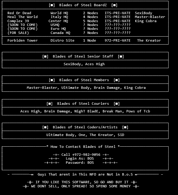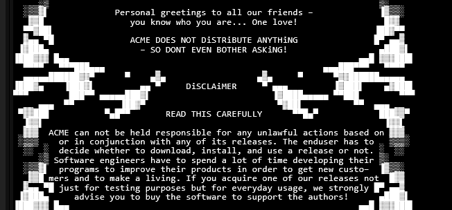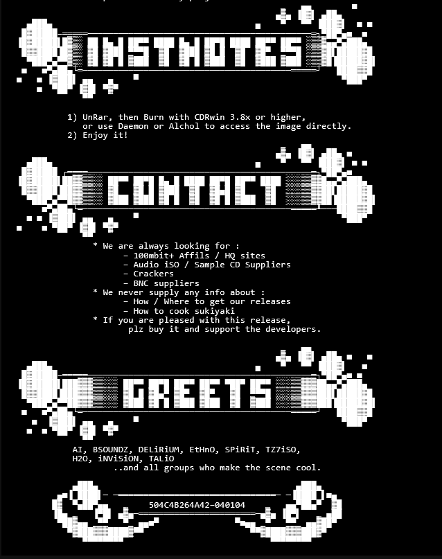 >>9962424 > И в чем она не права? Я тебе скажу так, крякеры никогда не были защитниками DRM, для них взлом был своего рода проверкой своих скиллов и насколько они могут зайти далеко со своими возможностями. Если выражаться ну совсем просто для них взлом был игровой площадкой. А некоторым из них даже удавалось взломать настолько сильные защиты, что они не выкладывали те ПО и просто оставляли те самые ПО на своих хардах. Потому что, то ПО по своей сути могло выступать своебразным усложненным "крякми" для них. И скажу тебе напоследок, ещё со времен BBS, крякеры в своих релизах писали, что они не продают свои релизы, а просто ими деляться, и если тебе понравился тот или иной продукт (музыка, ПО, игра, етц) - то приобрети продукт, и не будь жадиной. (привёл пикрилы как пример)