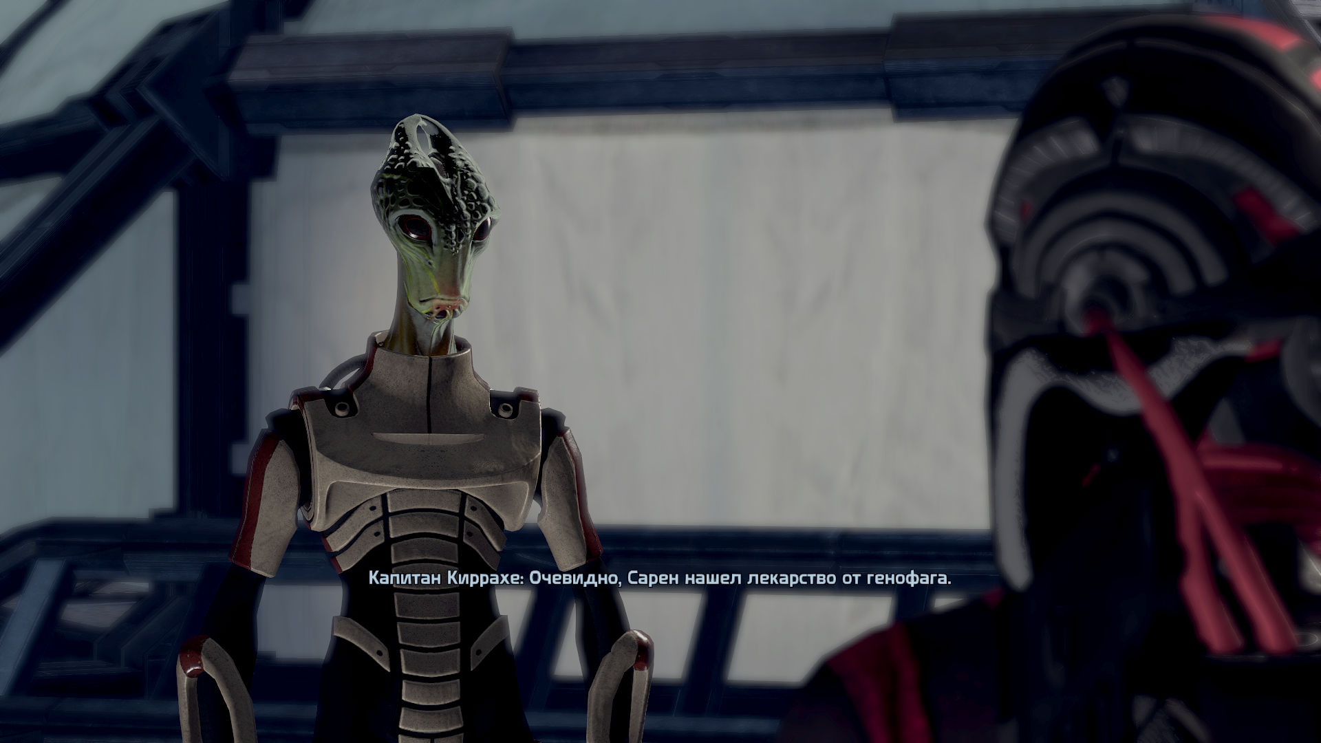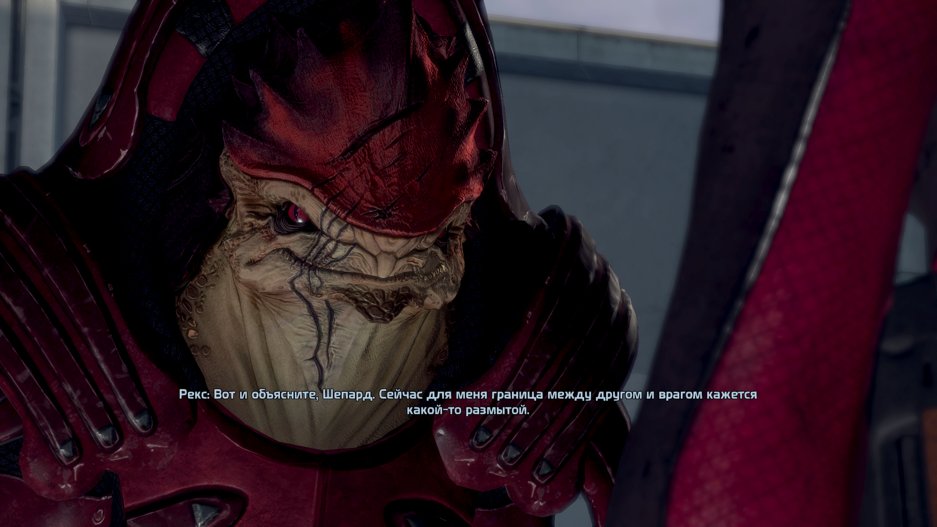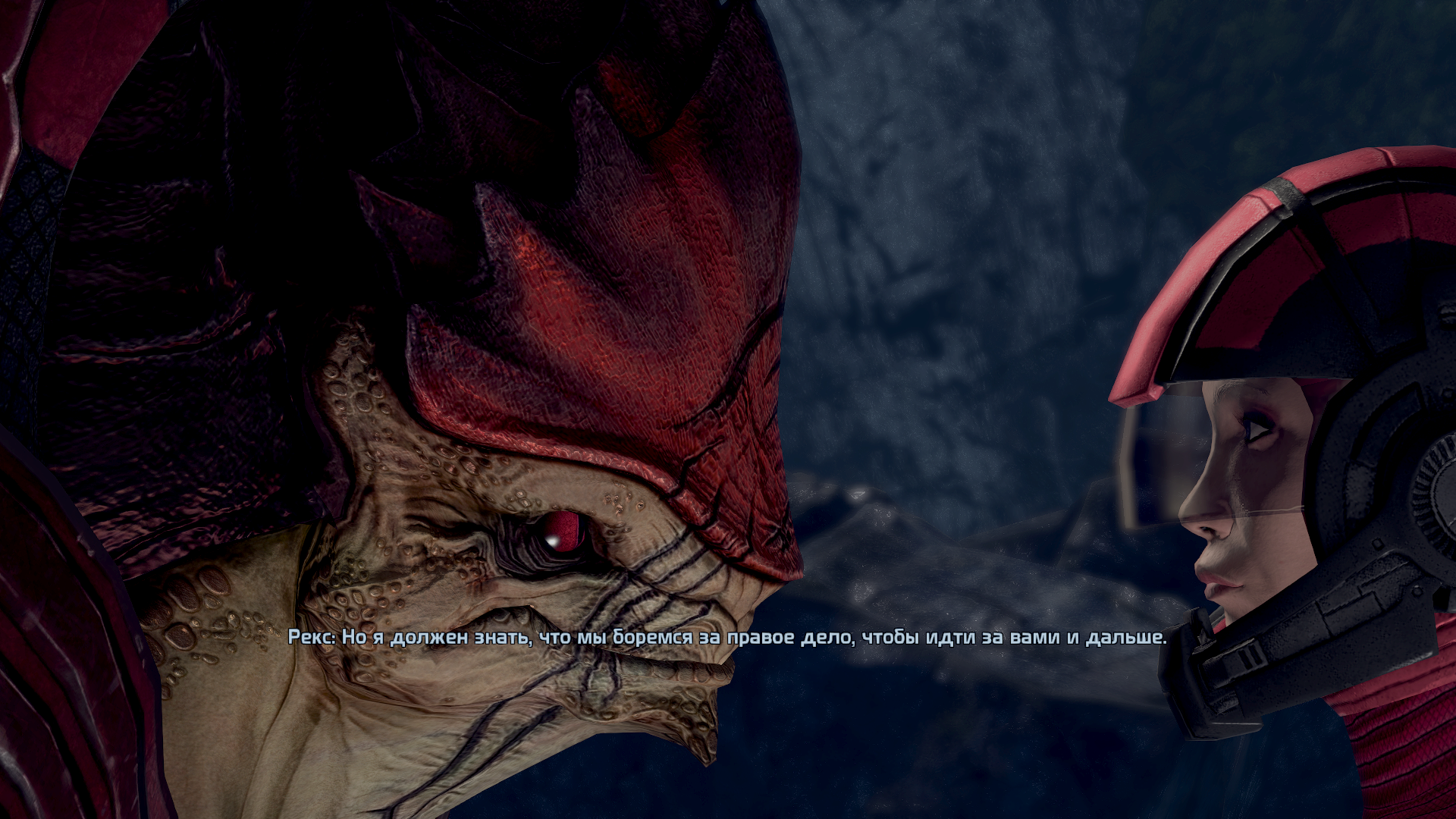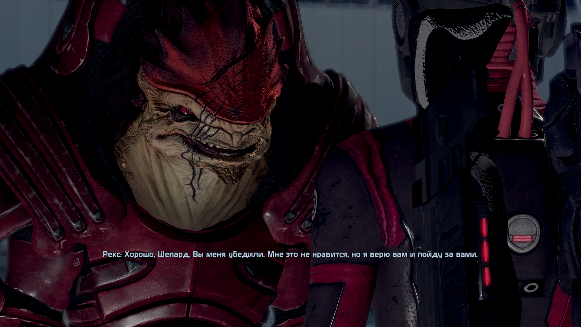 Ну вот, парой слов уговорили кипящую голову Рекса. Забавно что он даже не пытается сопротивляться если.. не хочется с ним говорить слишком много, ну вы понели. Шепард его просто пристрелит как беспомощную собаку. Не очень логично кстати то что всего-то пару циклов назад мы ему внушали что нужно заняться судьбой своего народа и он так легко от этого отказался. А во второй части вообще кричит от радости "Уииииии! Боевая сестра!"
