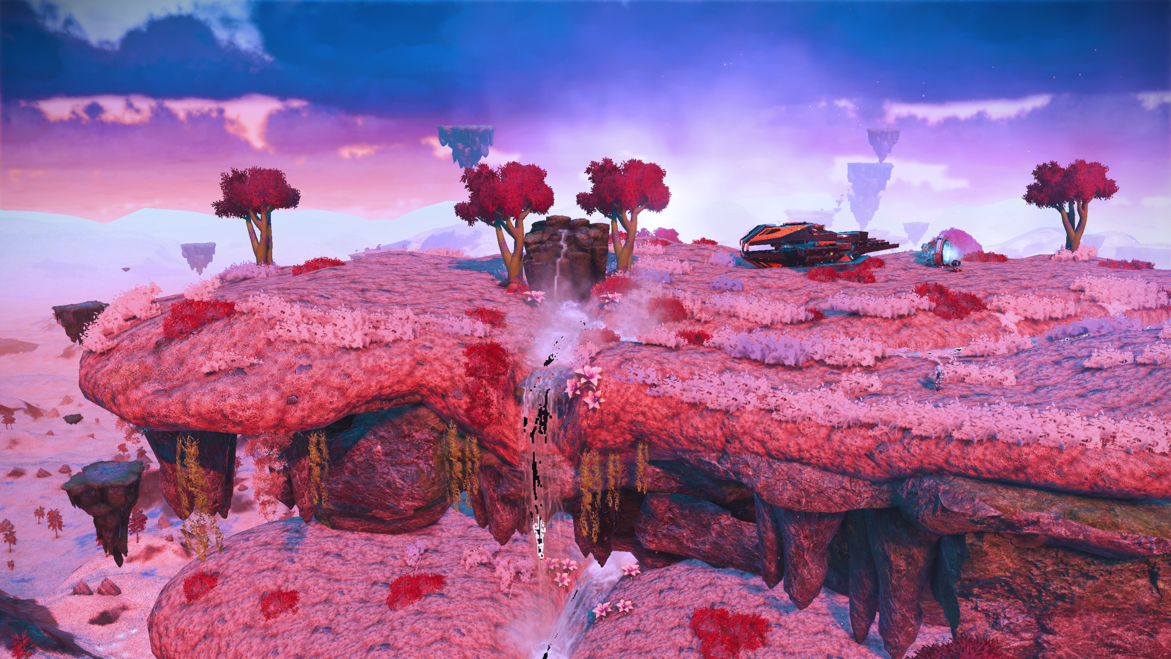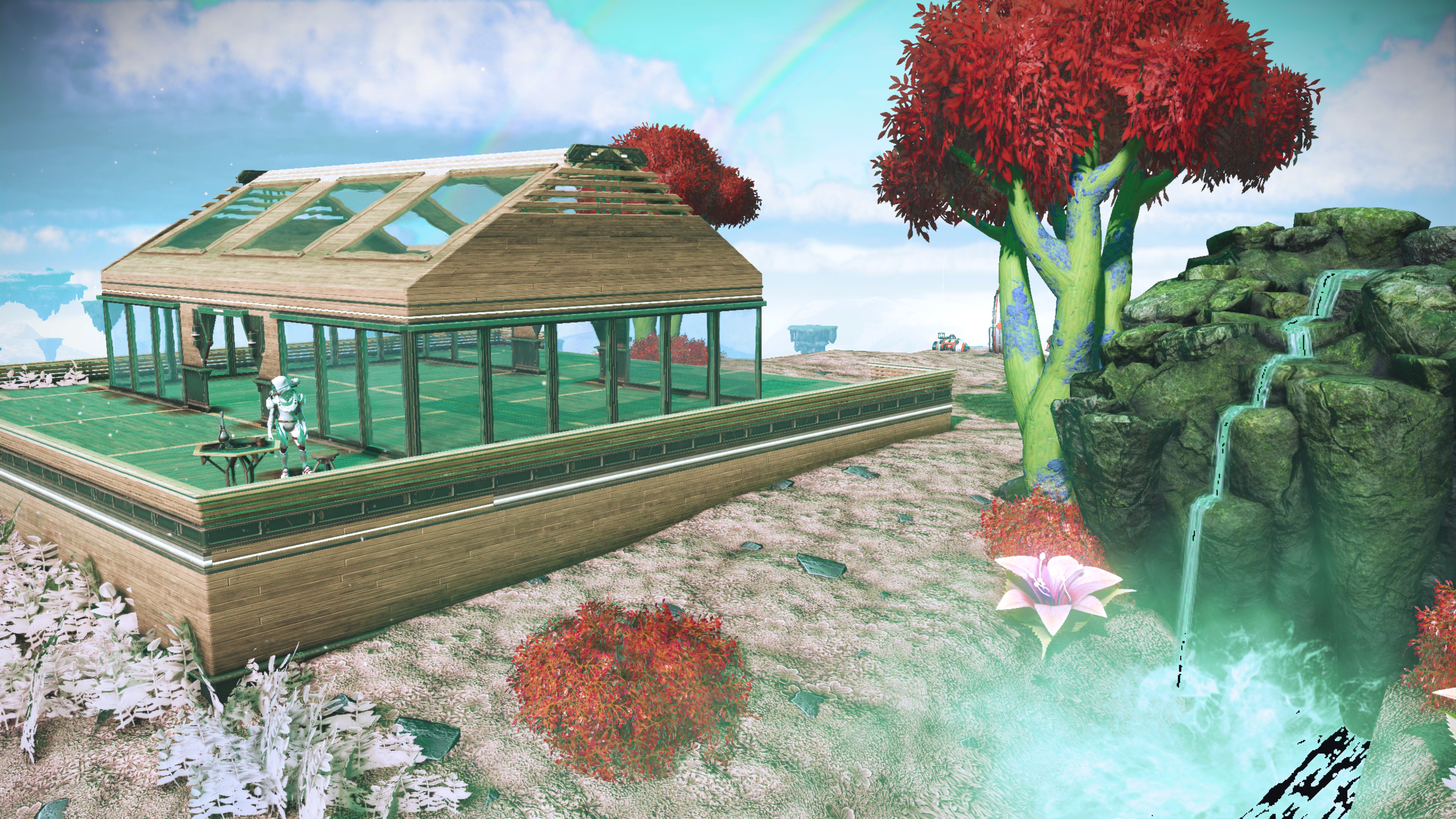 NMS. Нашёл ебейше, на мой взгляд, красивое местечко: летающая скала с водопадом и ручьями на ней. Ну и вид на окрестности очень неплох. Задумал построить там нечто типа крестьянского домика из средневековой Японии. Учитывая ограниченность инструментария игры и ограниченность собственную, построил пока что только ебучую теплицу. Буду думать дальше.