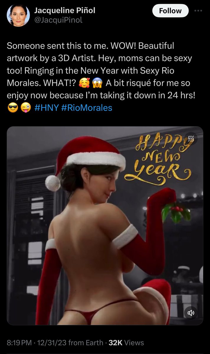 >>9980140 >>9980148 >>9980152 Напоминаю что Актриса которая подарила свою внешность Рио Моралес - вообще не против, а полностью поддерживает NSFW Контент с ее персонажем заявляя "Мамочки тоже могут быть секси"