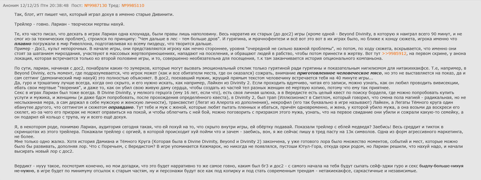 >>9990012 Не слежу. Но вот читаю >>9990007 и понимаю, что, сука, "надо только подождать". Обидно, конечно, что в итоге сами Ларианы просто открестятся от своего отца и продолжают делать дерьмо (как открестились Обсидианы от Авелона или Айспиклодж от Дыбы), но хоть какая-то высшая справедливость забрезжит. >>9990014 Надо же. Прямо как с Нилом Гейманом, примерным отцом очаровательного ребёнка, любящего кататься на велосипеде по кладбищам, который, как оказалось, заставлял фанаток жрать его говно (Нил Гейман, не ребёнок, лол).
