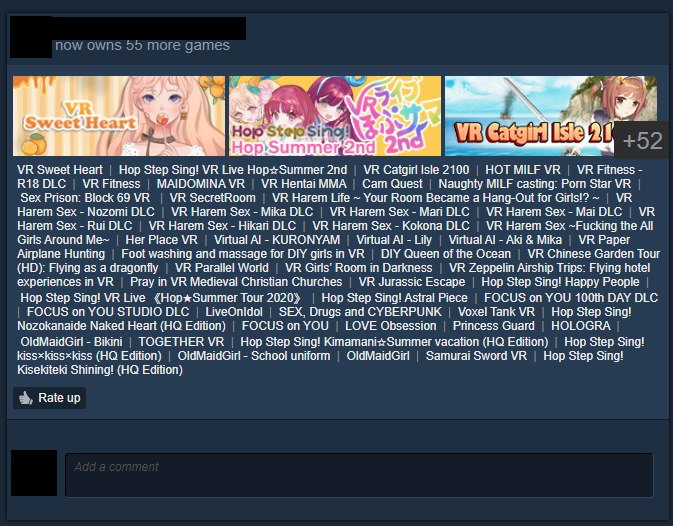 >>10002998 (OP) А помните как раньше давали коллекционные карточки за просмотр рекомендаций, а не сранные школоло стикеры? А мини-игры где пользователей распределяли по командам и давали бесплатный уникальный значок? В общем даже стим начал скатываться в парашу.