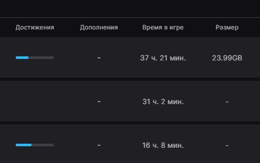 >>10010669 Что конкретно ачивки или время, вот только что сделал скрин, и у неустановленной и у установленной показывается время и ачивки, если они есть ( там где указан размер это установленная игра)