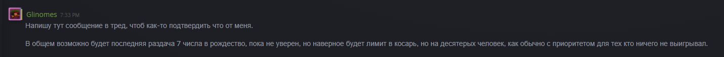 https://steamcommunity.com/id/glinkomes/ Напоминаю про раздачу в 19:00 по МСК, первые пять человек... может первые семь если настроение хорошее будет. Иконка в пределах 2000 рублей, можно ссылки на плати-ру и подобное. Приоритет для тех кто не побеждал 25 числа.