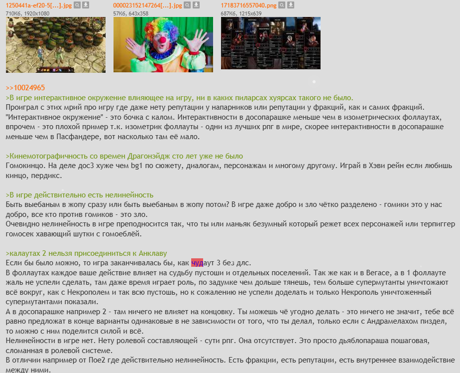 >калаутах 2 нельзя присоединиться к Анклаву Если бы было можно, то игра заканчивалась бы, как чудаут 3 без длс. В фоллаутах каждое ваше действие влияет на судьбу пустоши и отдельных поселений. Так же как и в Вегасе, а в 1 фоллауте жаль не успели сделать, там даже время играет роль, по задумке чем дольше тянешь, тем больше супермутанты уничтожают всё вокруг, как с Некрополем и так всю пустошь, но к сожалению не успели доделать и только Некрополь уничтоженный супермутантами показали. А в досопарашке например 2 - там ничего не влияет на концовку. Ты можешь чё угодно делать - это ничего не значит, тебе всё равно предложат в конце варианты одинаковые в не зависимости от того, что ты делал, только если с Андрамелахом пиздел, то можно с ним поделится силой и всё. Нелинейности в игре нет. Нету ролевой составляющей - сути рпг. Она отсутствует. Это просто дьяблопараша пошаговая, сломанная в ролевой системе. В отличии например от Пое2 где действительно нелинейность. Есть фракции, есть репутации, есть внутреннее взаимодействие между ними. >В старые бг я сомневаюсь, что кто то реально играл из местных Борда 18+ Впрочем я не сомневаюсь, что ты и из храма испытаний не выйдешь.