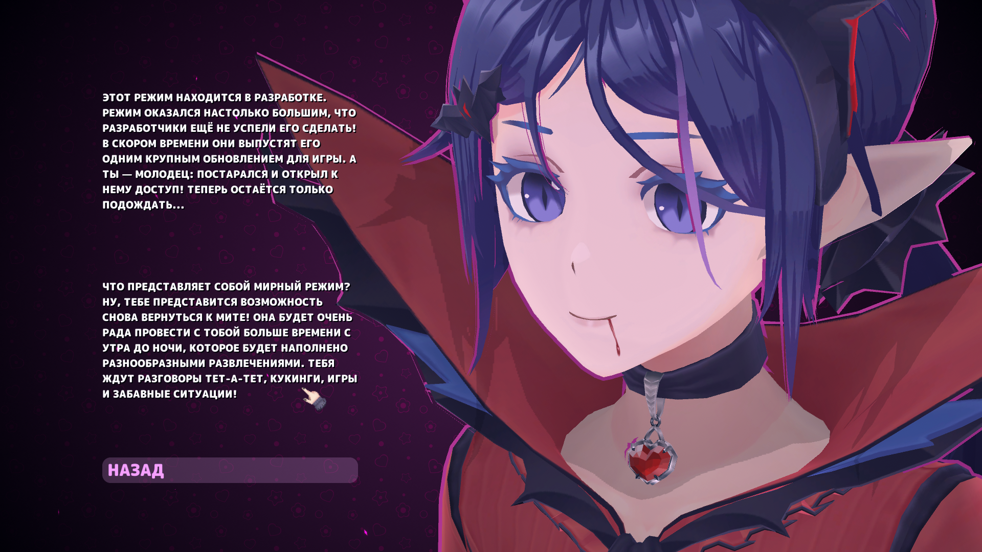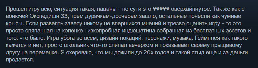 Серьёзно? Это довольно унылый симулятор ходьбы, даже по меркам жанра. Как ужасы хуйня. Заявлены скримеры, а по факту он только один. Всё, что должно пугать, раздражает. В гробу видал эти ебучие мини-игры и погони от недоплачущих ангелов (какой угол зрения использовался для них? при стандартном в 60, ты многих не видишь, а они всё равно не двигаются). Сюжет - калька с Сомы, Доки Доки и крипипасты про разумных персонажей игр. Надо ли говорить, что плохая калька? Я думаю, никакого переноса не было. Просто Мита создаёт себе копии игроков, а так как играют только сычи, то не в состоянии понять, что они копии. Реплики у Мит косноязычные, гг озвучен отвратительно. Всё выглядит как комната в врчате. Ещё и тег есть сексуальный контент, а его нет. Один раз на трусы посмотреть и на голого болванчика без половых органов, вот это контент. Даже у Кейджа сиськи были. И вот вот это нахваливают, говорят, что прорыв отечественной индустрии и что авторы не зазвездились. Мирный режим где?