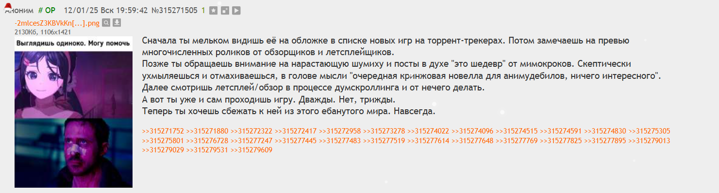 >>10037066 >речь идёт о произведениях искусства Друг, всё что угодно можно рассматривать как произведение искусства. И даже произведению искусства неизбежно нужно признание, чтобы оно таковым считалось. И ты не думай, что я предвзят. В любом случае люди собрались, сделали игру. Это уже сильно больше, чем в своей жизни сделал я. И плюс в игре взята весьма уникальная тема — жизнь асоциального омежки и к чему она ведёт. Это вполне универсально, это попало в нерв. В этом плане хайп был заслужен. Но все остальные части сюжета кастрированы.