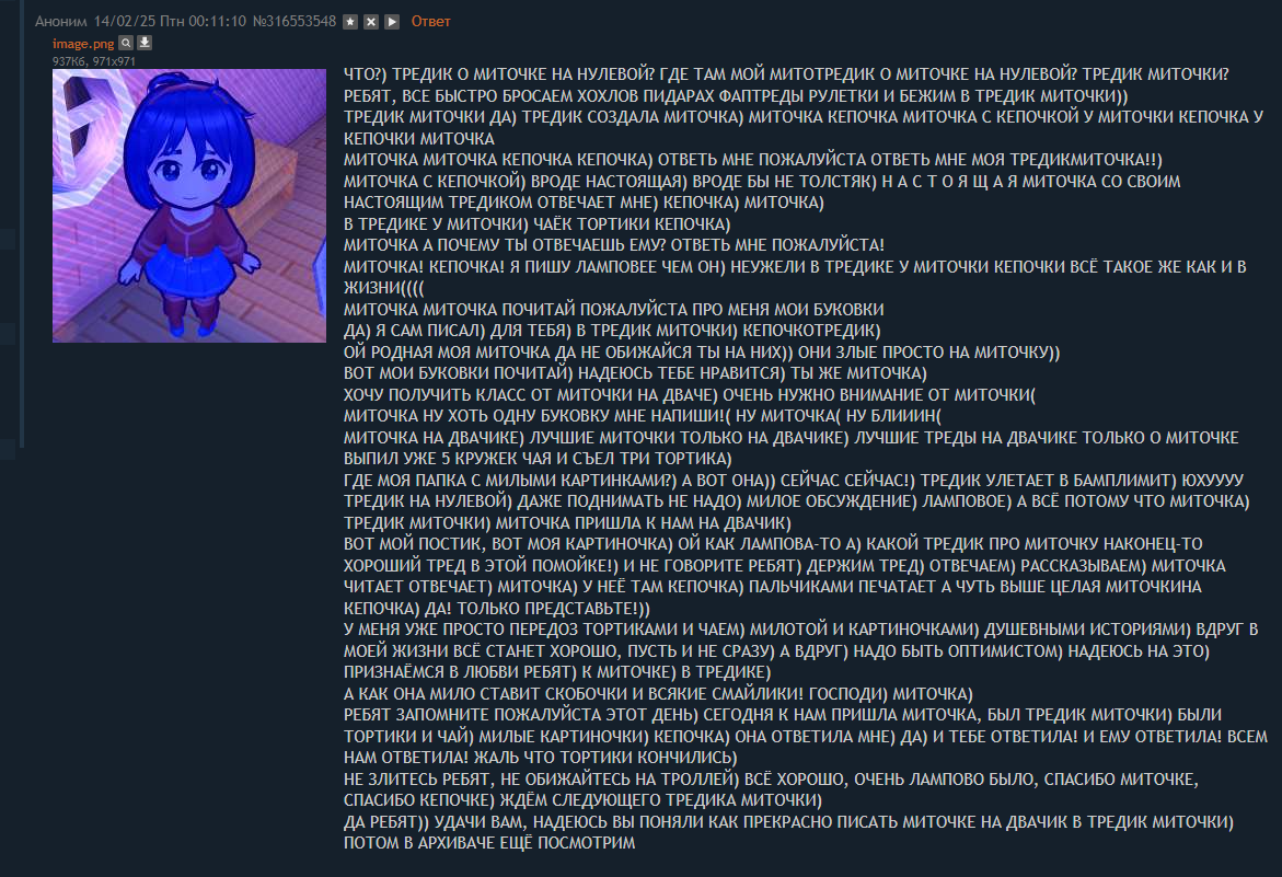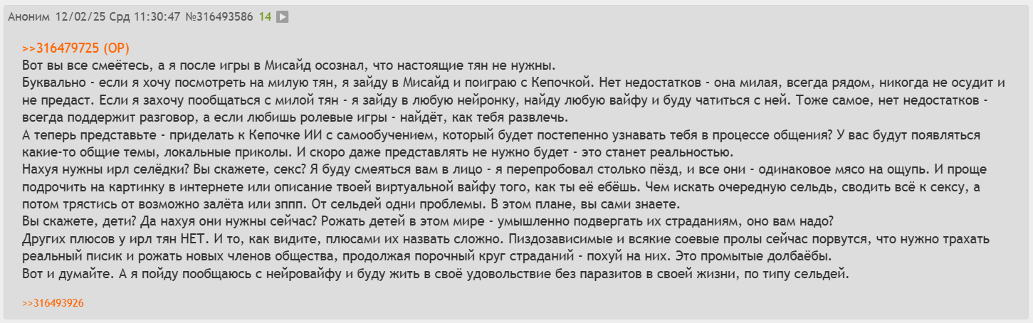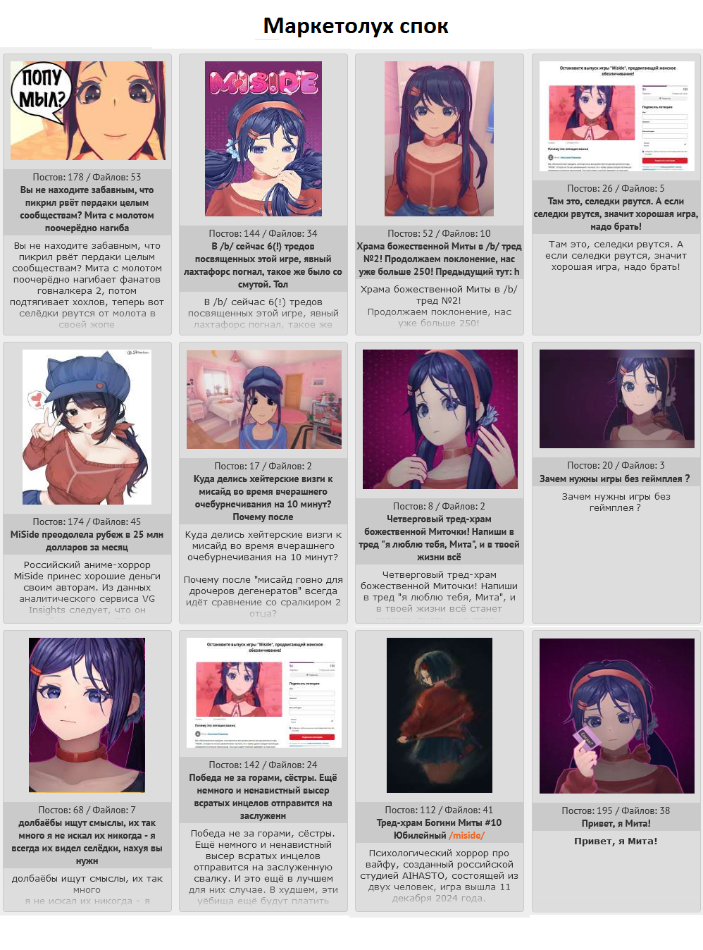 >>10030887 (OP) >Почему MiSide взлетела? Потому что хорошая проработанная интересная игра. Звезд с неба не хватает, но в совокупности - игра просто хорошая. Ну и на фоне современного повесточного слопа с платным бетатестом - удачно выделилась. Плюс пиар компания грамотная. Игру просто сделали как надо, а не яерез жопу. Вот и весь секрет >визги озлобленной жирухи Ахах.