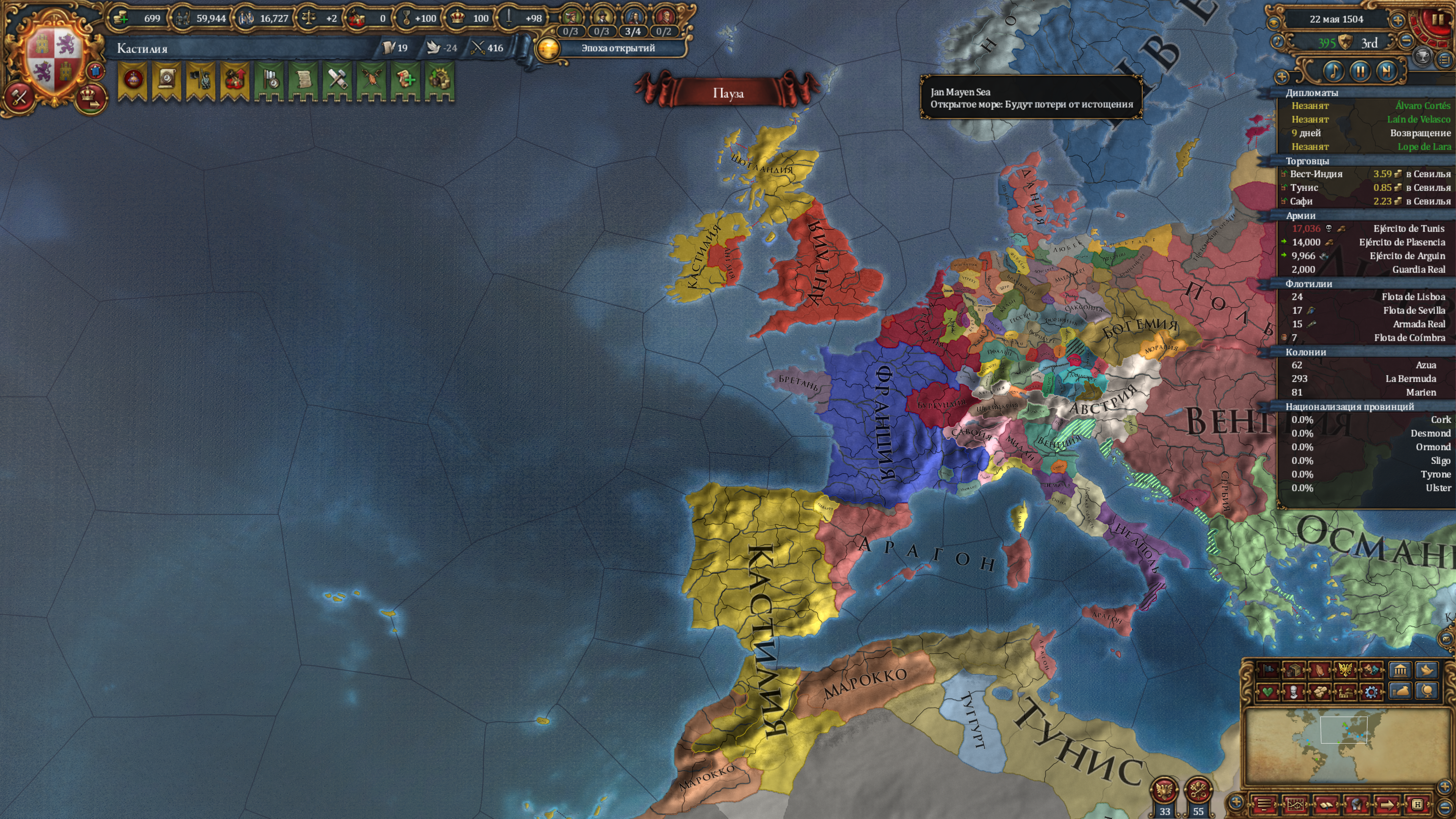 Хуй знает зачем захватил у Англичанина вонючего Ирландию. После моей войнушки в Италии, в Европе была коалиция огромная ну я и решил пока она там остужается, пиздать по островному овцеёбу. Он ещё исследовательские идеи первыми взял, хотя бот обычно их 2ми берёт. В любом случае, сейчас его обссать и в будущем его флот не будет угрозой. Но пока я воевал, кабоверде колонизировал Норвежец блять лол. Короче моя колониальная гонка будет с Норвежцем, что весьма удивительно.
