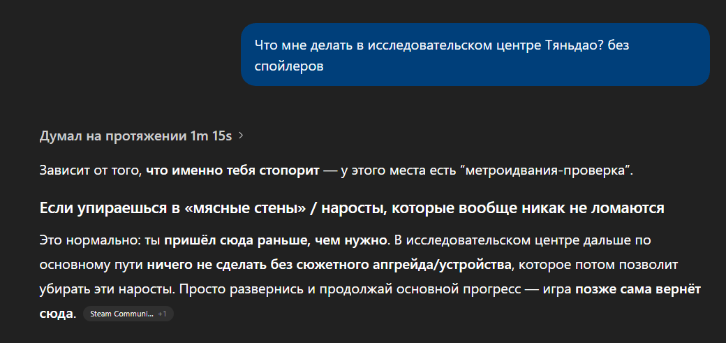 Второй день прохожу outer wilds, в первый день охуевал как игра давит на некоторые фобии, а сегодня уже задушился от подачи сюжета, хотя мне кажется что 3/4 уже прошёл. Ну и ютуберы слишком уж перехвалили, нулевой резист к спойлерам серьезный минус - начинаешь уставать и душиться, случается затуп на который не хочется тратить время, и если захотел узнать как пройти стабильно ловишь х3 ненужных спойлеров, патовая ситуация. У обычных линейных игр такого не было, например прошел сх2 ремейк зная главный спойлер и было совершенно похуй на это, впечатление ничуть не смазалось. Попробую наверное отдохнуть и добить, но сомневаюсь что сильно что-то изменится