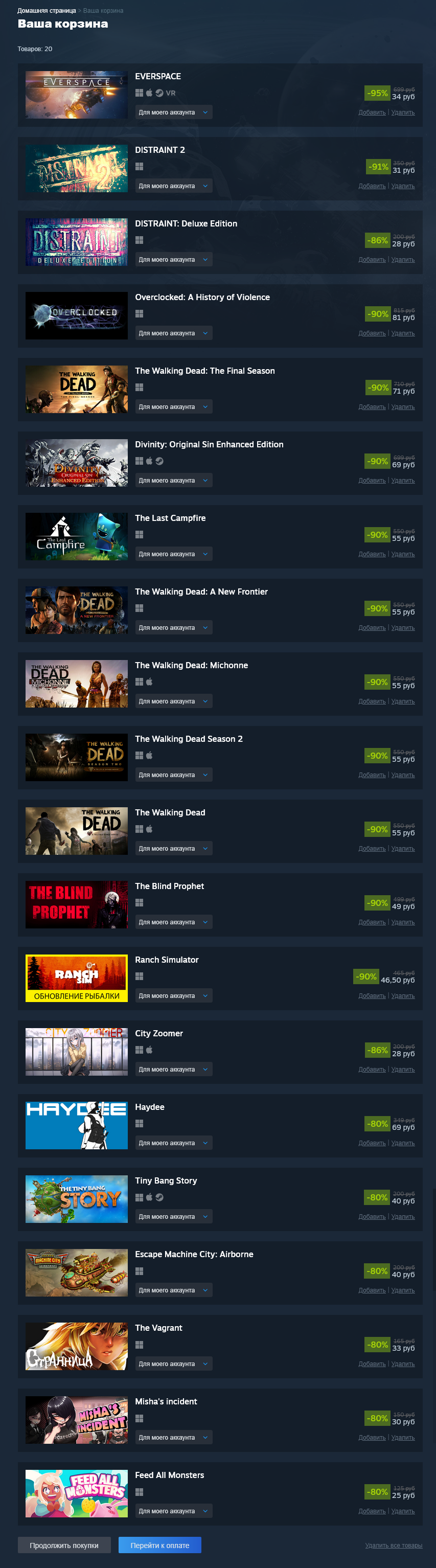 Беру только те игры, в которые планирую играть либо сейчас же, либо в самое ближайшее время, обычно 3-4 штуки. Следующая большая распродажа будет весной, там докуплю что действительно будет мне нужно. А то так однажды накупил охапку игр, которые до сих пор не запускал даже, а они уже продаются с бОльшей скидкой, а в некоторые я чет перехотел играть.