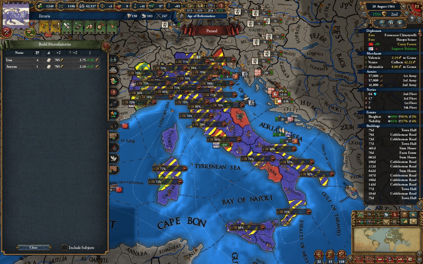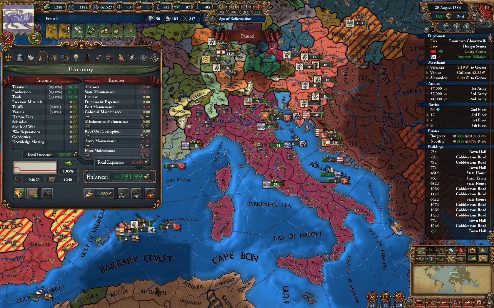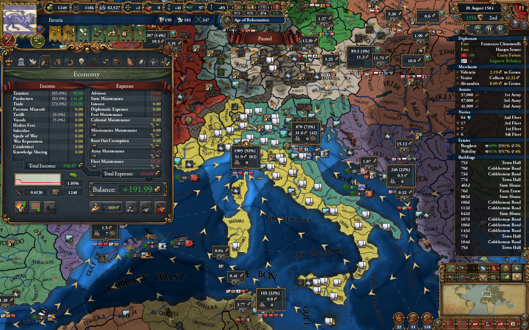 >>10055234 >>10055244 Самый обычный доход, просто нужно правильные идеи и реформы брать. 75-85% бонусов по итогу имею к доходу + вся страна застроена мануфактурами и мастерскими + имею большое влияние в двух крайне богатых торговых нодах - Венеции и Генуе - и перегоняю в них торговлю купцами и корабликами из Валенсии и Александрии + высокое среднее развитие = профит