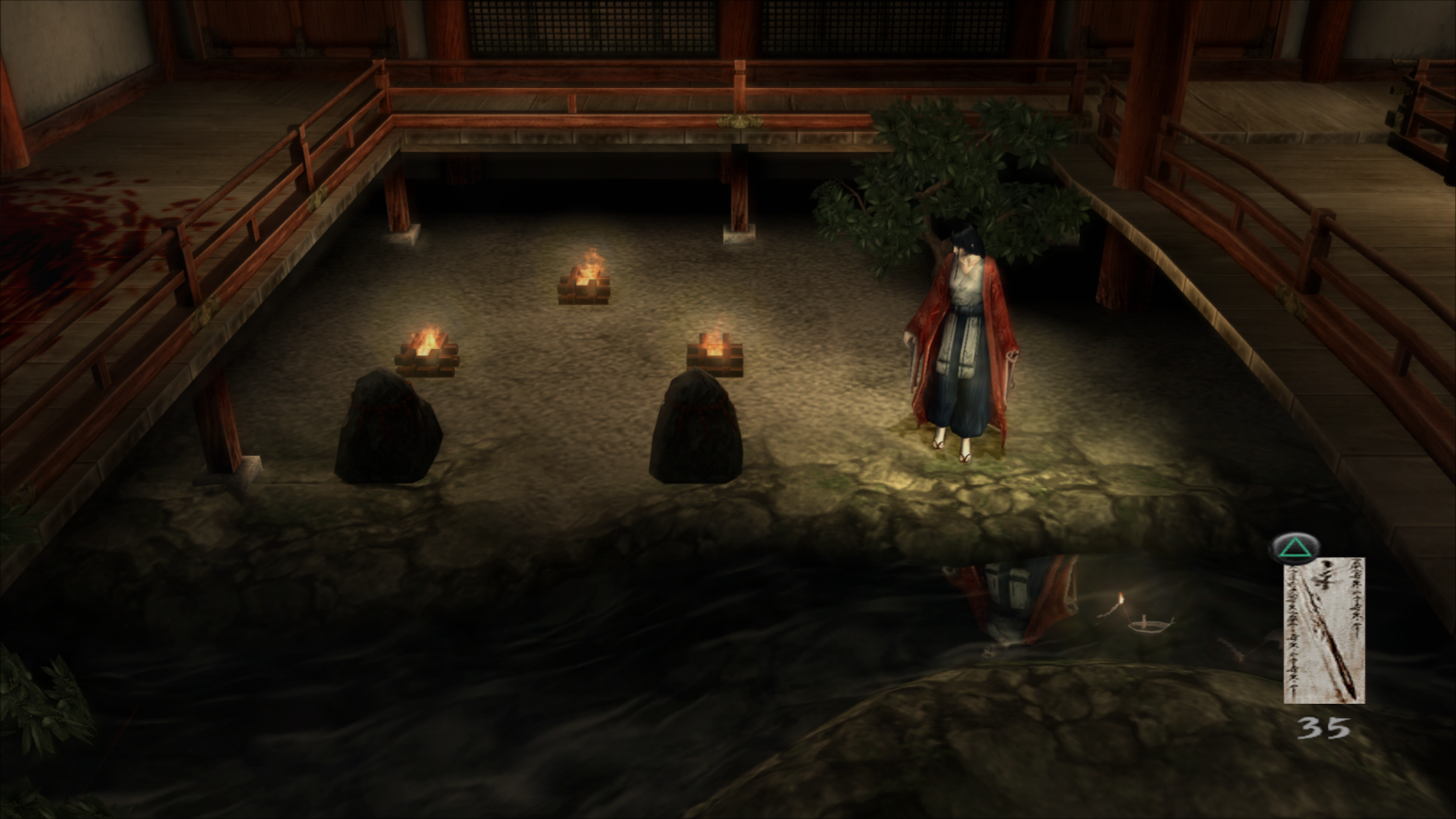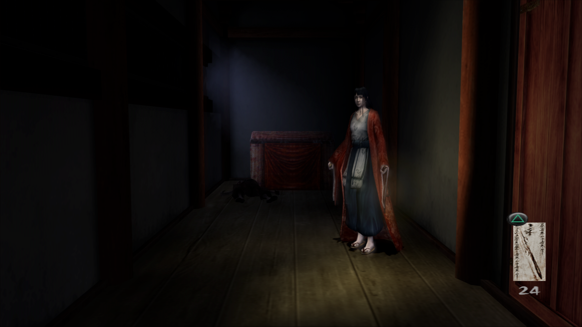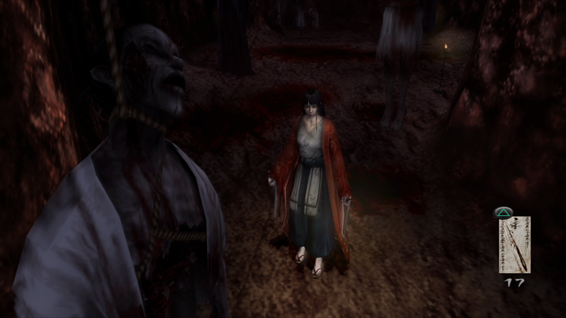 Атмосфера тут отличная. Эту фразу можно сказать про множество игр, даже если все остальные аспекты ужасны и портят эту самую атмосферу. Мол, "персонажи хуйня, диалоги хуйня, сюжет хуйня, монстры хуйня, все хуйня, но вот есть конкретный скриншотик, где камера закреплена под необычным ракурсом и все это НА СЕКУНДУ выглядит интересно" (пока не начнешь непосредственно играть в игру). Здесь же она реально на уровне более успешных конкурентов, причем от начала до конца, без хуйни. Такой-то сверхъестественный, эзотерический хоррор, главная тематика которого - обряды, призванные воскресить умерших. Только здесь не банальное воскрешение аля призраки/зомби/вампиры, а какая-то мифологическая около боди-хоррор хуйня, где умершие "сливаются" с живыми в процессе жертвоприношения, а спустя время начинают гнить заживо и нужно проводить обряд по новой. Это не совсем заслуга игры, т.к. напрямую спизженно с японских мифов, но тем не менее. Фатал Фрейм 2, кстати, очень похож тематически - тоже две сестры, тоже перерождение. Но здесь перерождение, как я уже сказал, более "телесное", а не духовное.