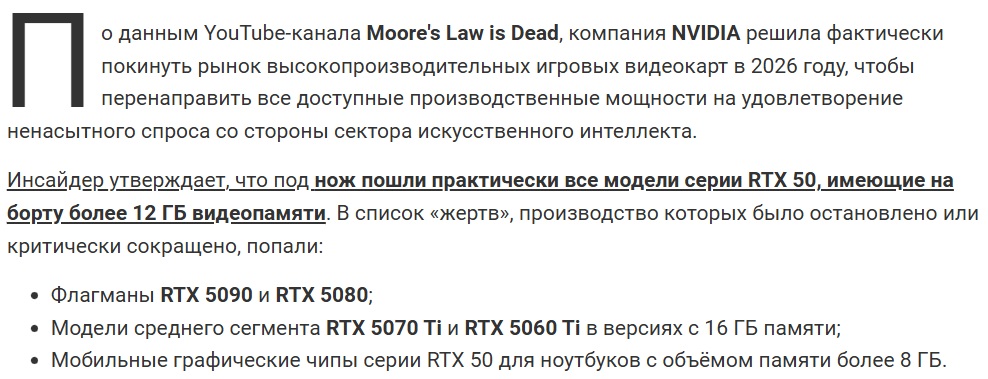 >>10062240 Ну зато системные требования приостановятся... Оперативки больше 16 вряд ли в минималках станут делать, больше 6-8 гигов видеопамяти тоже.. И консоли нового поколения выйдут позже..