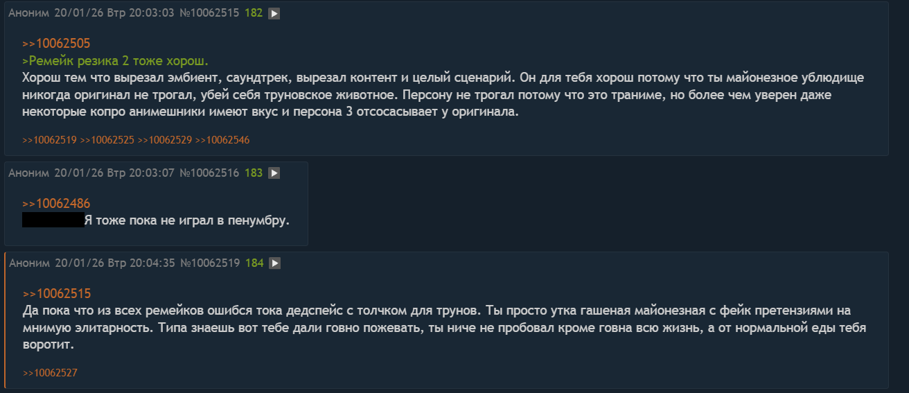 Все ремейки - это демейки. Нет ни одного примера где не проебан саундтрек, дизайн, и не навалено цензуры и прочей дрисни. Поэтому я двачую того чела, убивать всех кто просит ремейки, это пидарасы конченные и скорее всего оригинал они никогда не любили. Ремейки просят хуесосы которые отфильтровались от оригинала по какой-то причине, в основном слабый интеллект в этом решающую роль играет. Человек который любит оригинал ни за что ей не пожелает участь стать сгенерированной на урине парашей для пс5 поколения говно индустрии кАААла.