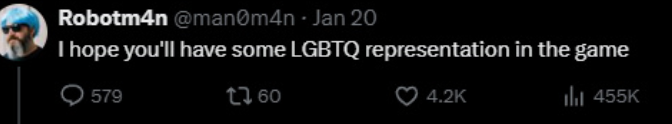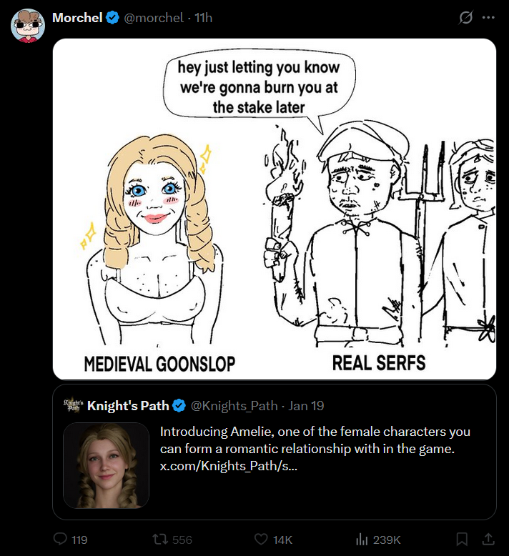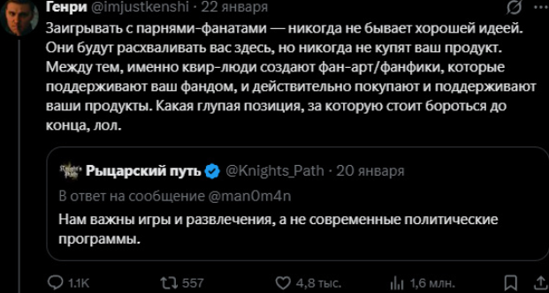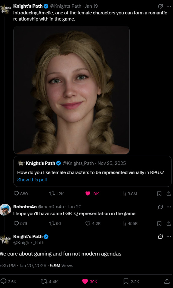 На твиторе после того как разрабы игрушки Knight's Path показали милую тяночку, типа спутница для романса, блеваки потребовали и лгбт романов Разрабы ответили нет и начался сущий кошмар