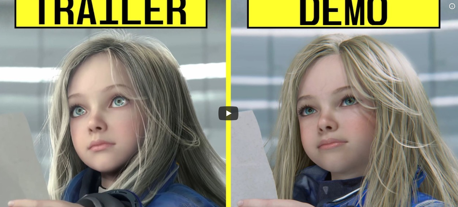 даунгрейднули волосню. в трейлере была симулированная, в демке приклеенная. и освещение. трейлер рендерили видимо арнольдом в майке, в демке консольное освещение, чтоб нищебокс тянул
