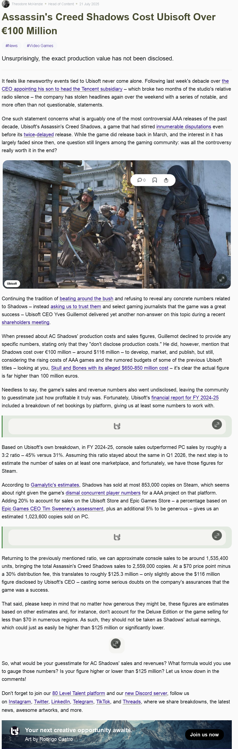 >>10066074 > что самый продаваемый ассасин в истории, стал гвоздём в крышку гроба компании? Возможно ты пропустил, но у них 80% бюджета всех игр это бабки от государства и на 1 успешный ассасин по 6 провальных. Афросамурай вполне может быть самым успешным (по оф инфе продажи и есть самые высокие) но на самом деле на это всё похуй потому что опять же бабки от государства идут. А значит и вопрос сколько ассасинов будет за год высрано решается даже не самими юбисофтами.